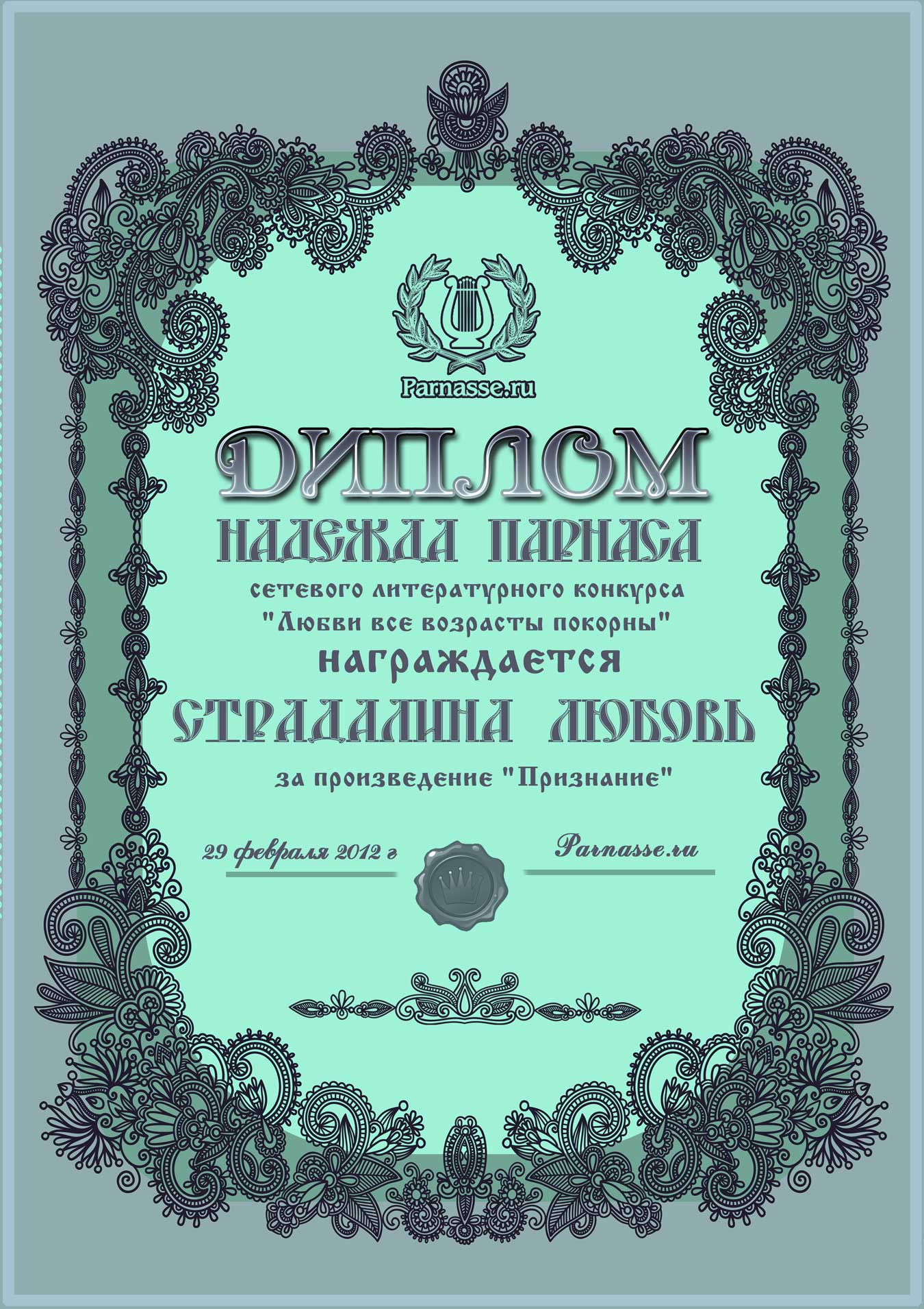 От лица Администрации творческого портала "Парнас" вручаем Вам этот памятный знак с самыми наилучшими пожеланиями! Пусть Вас весь год не покидает творческий запал, удача, а здоровье будет столь же крепким и нерушимым, как и традиция Новогоднего праздника! Счастья, успехов и любви Вам и Вашей семье, друзьям и близким!
