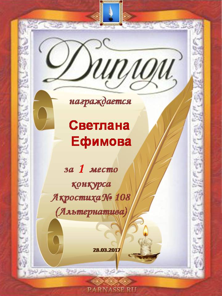 Диплом за 1 место в 108 конкурсе АКРОСТИХА (Альтернатива)! ПОЗДРАВЛЯЮ!