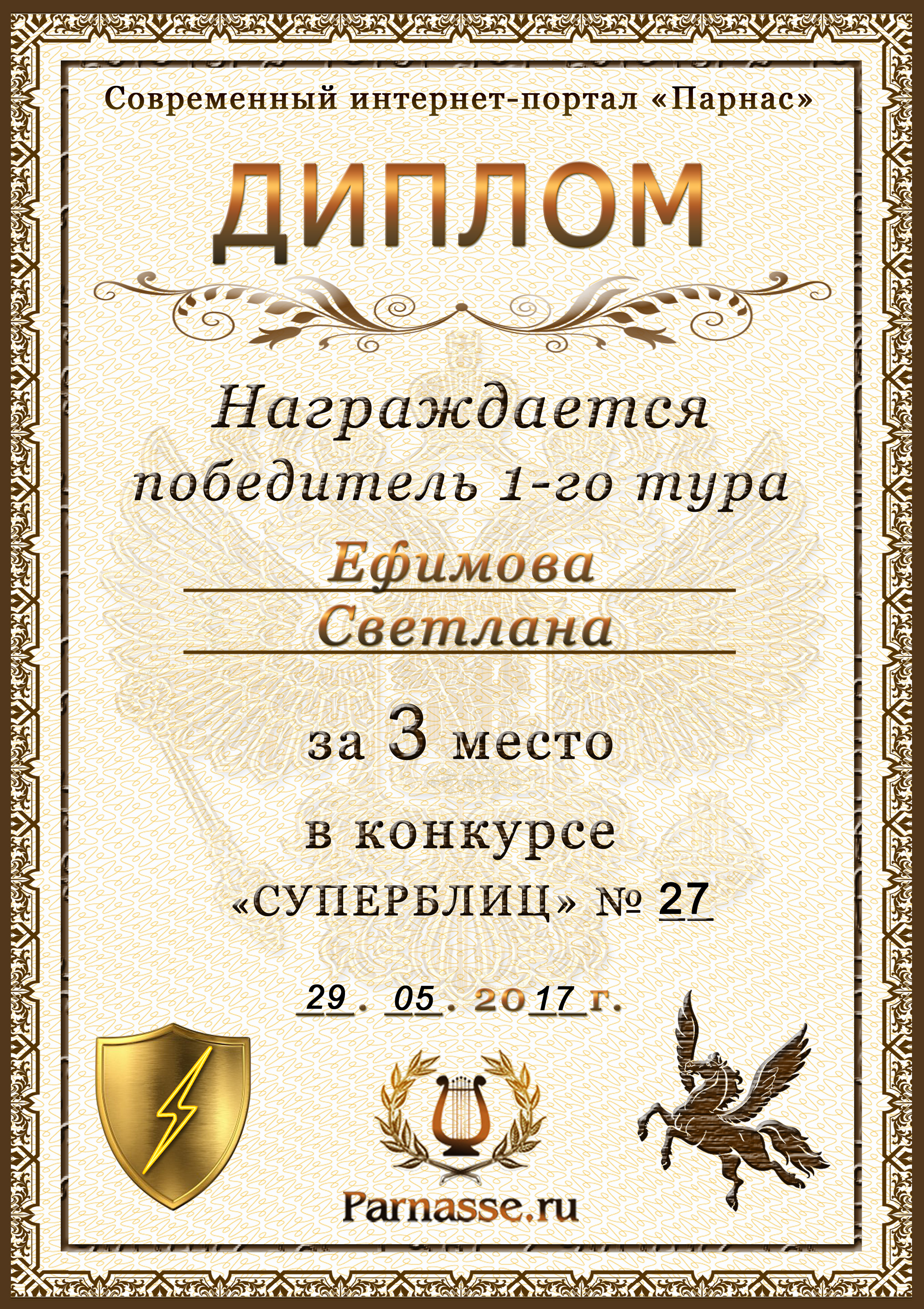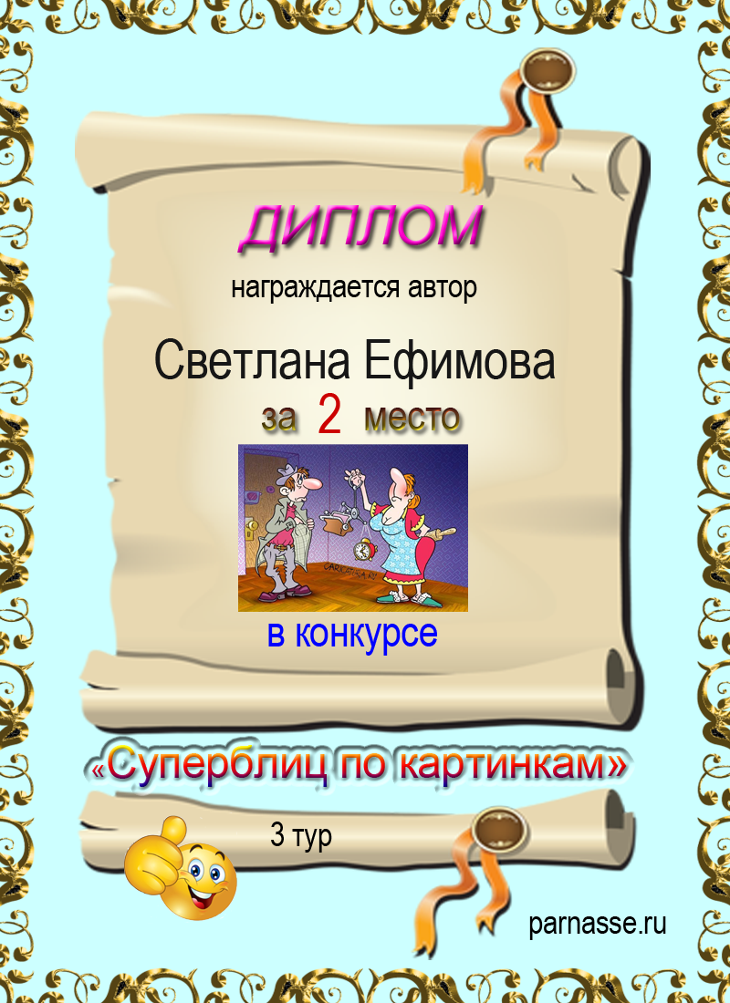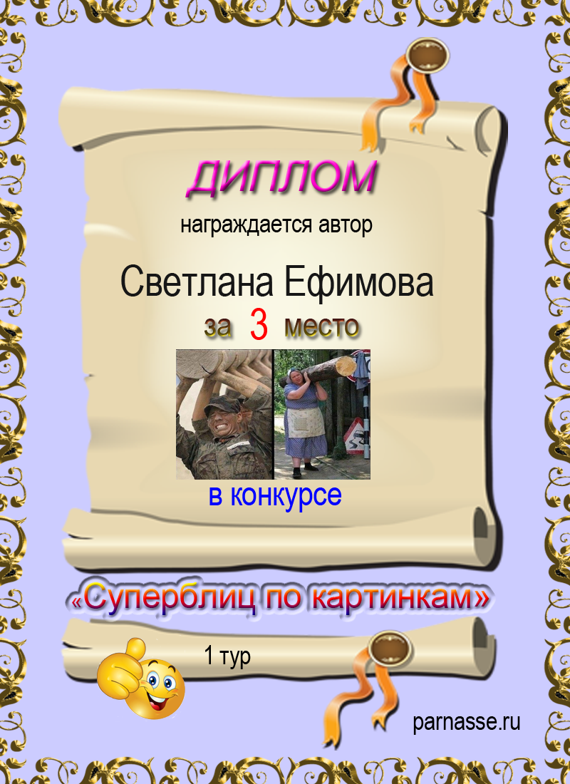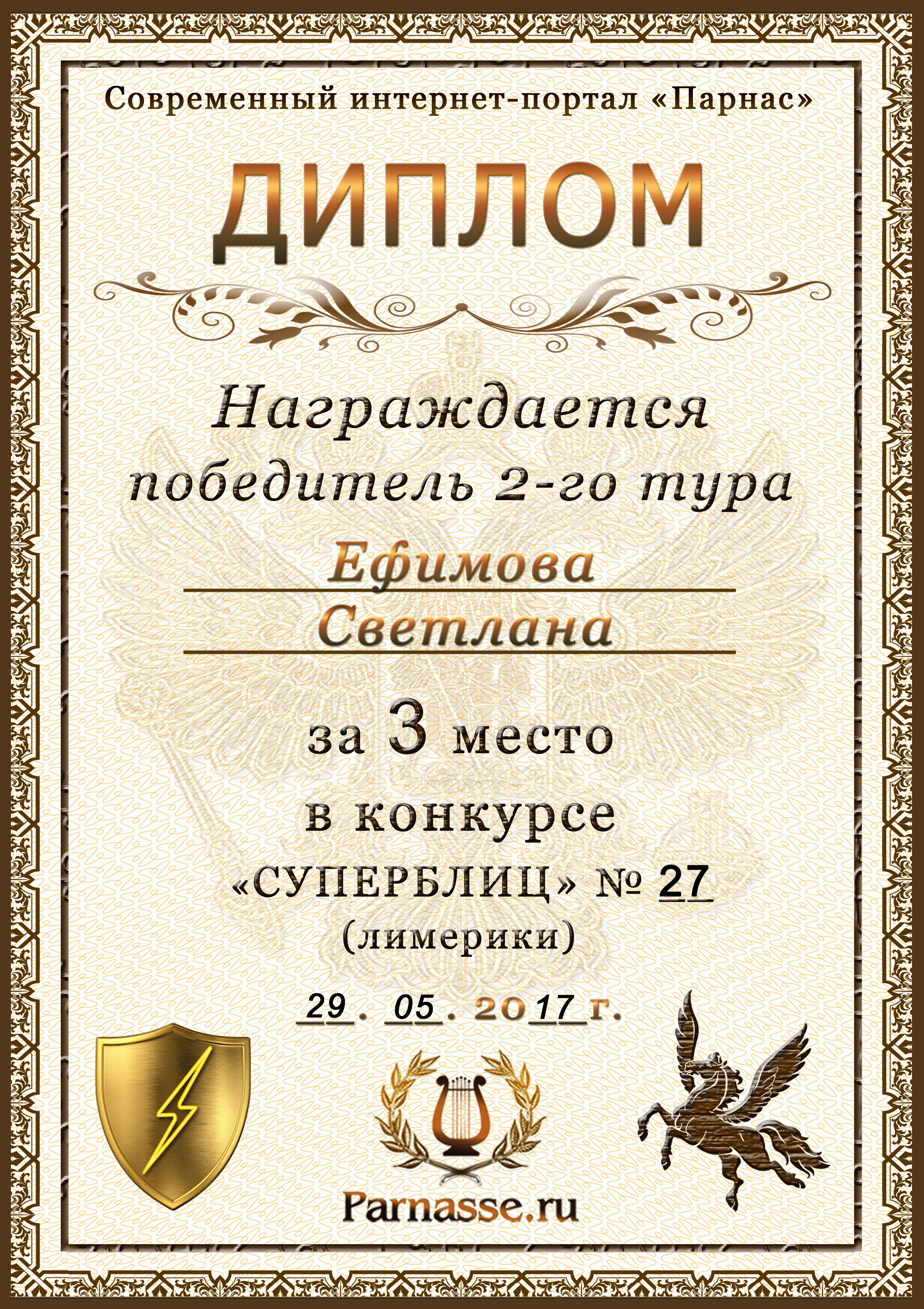 Диплом за 3 место во 2 туре (лимерики) в конкурсе СУПЕРБЛИЦА № 27!ПОЗДРАВЛЯЮ!