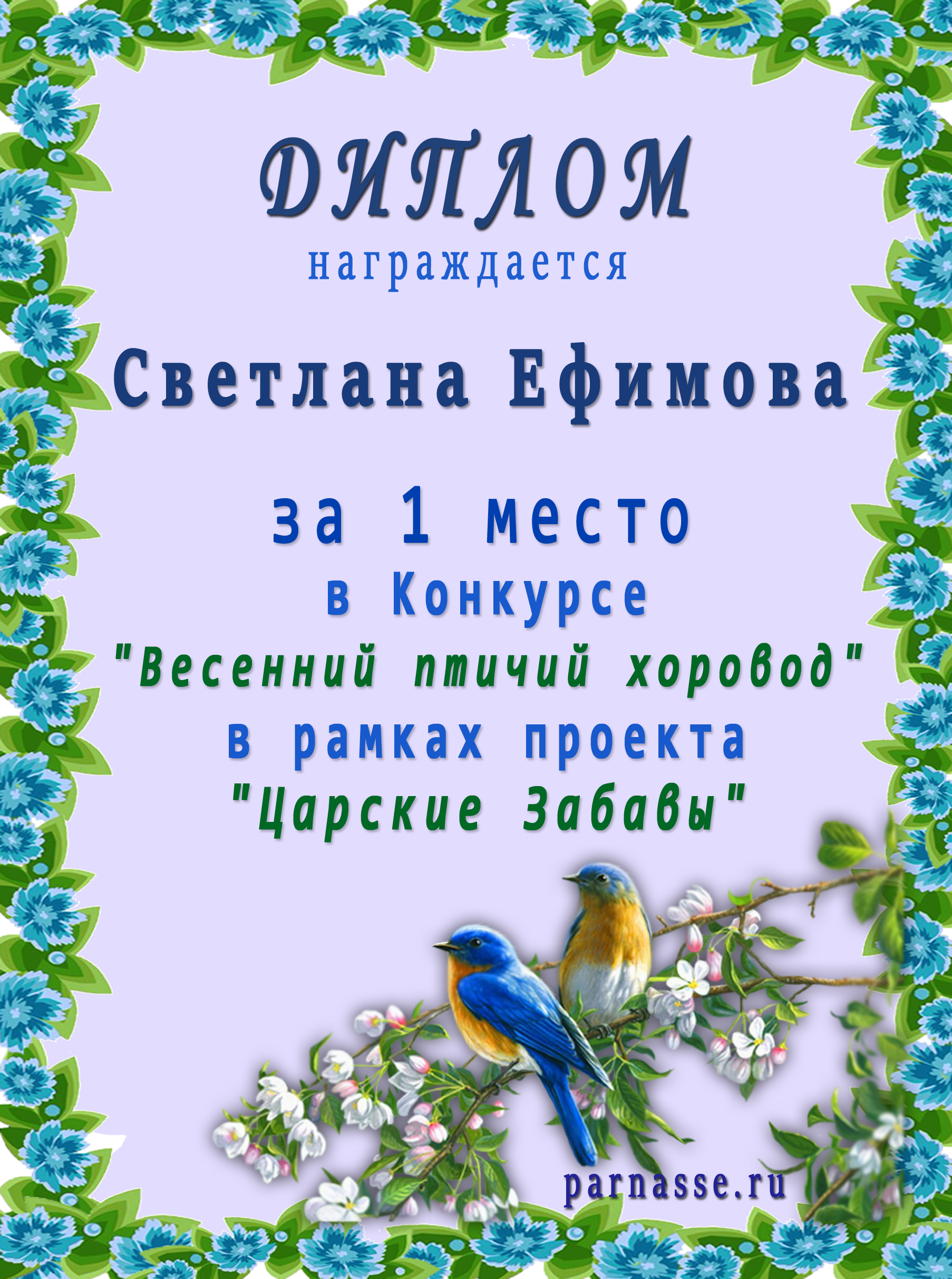 За 1 место в Конкурсе "Весенний птичий хоровод" в рамках проекта "Царские Забавы"