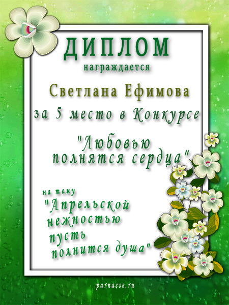За 5 место в Конкурсе "Любовью полнятся сердца" на тему "Апрельской нежностью пусть полнится душа"