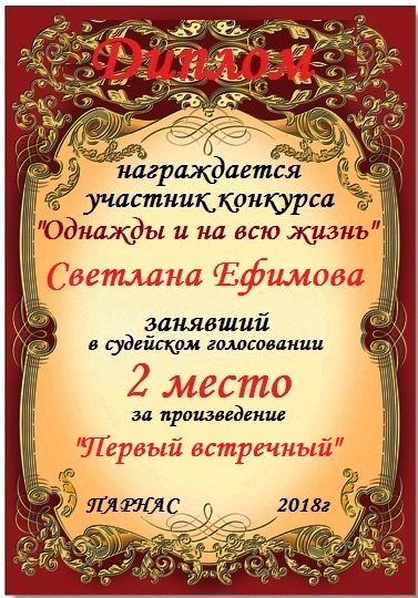 Второе место в конкурсе "Однажды и на всю жизнь" в номинации "Сказание о Любви", произведение "Первый встречный", судейское голосование. Поздравляем с прекрасной победой!