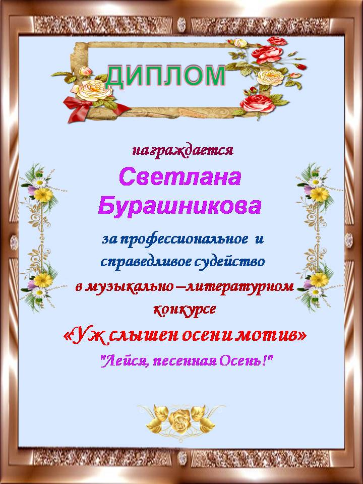 Благодарим Вас за квалифицированное, оперативное, беспристрастное судейство поэтической номинации "Поэтический осенний вальс" в музыкально-литературном конкурсе "Уж слышен Осени мотив". Большое спасибо, Светлана, за судейство, за потрясающе красивые, талантливые стихи. Удачи Вам, успехов, всех благополучий в жизни и делах. Спасибо, Светлана, за Вашу искренность, душевность и Ваш писательский талант!