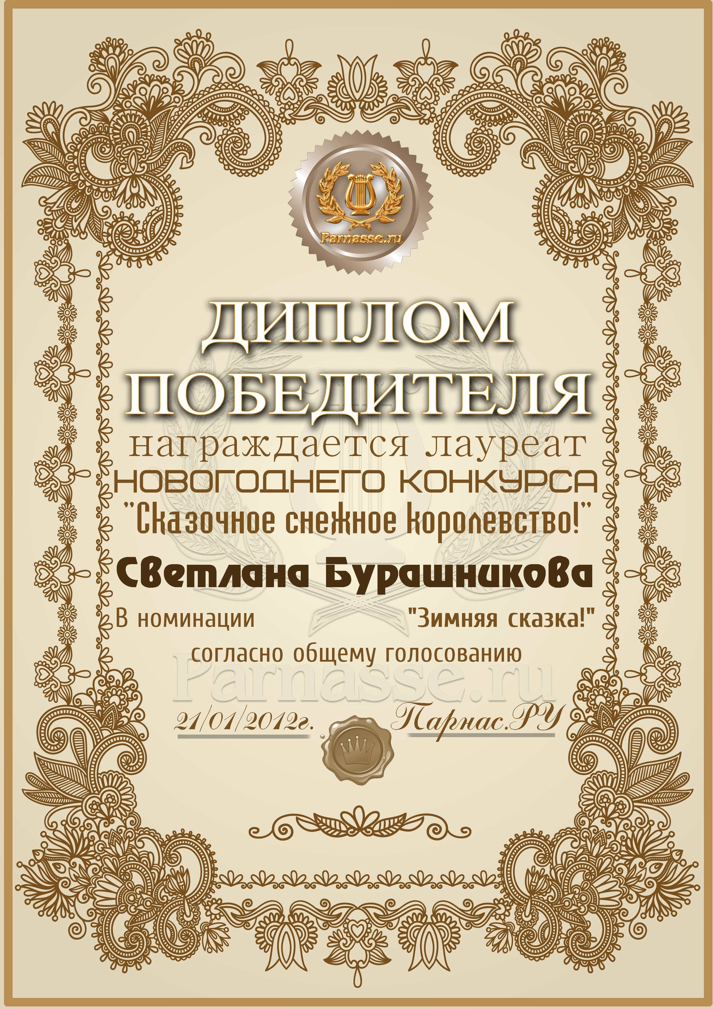 Второе место в музыкально-литературном конкурсе «ЗИМНЯЯ СКАЗКА», в номинации «Снежный карнавал»! Автору слов песни «Новый Год»! Поздравляем с блестящей победой в конкурсе, Светлана!