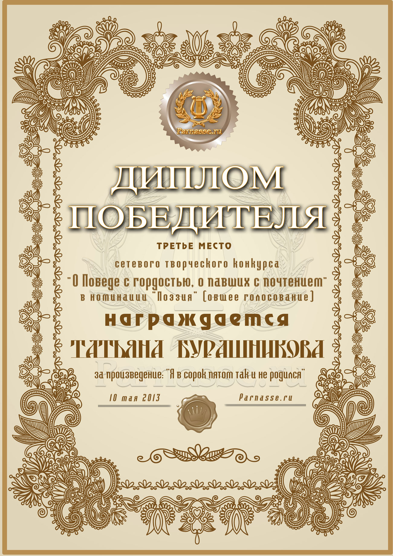 Первое место в музыкально-литературном конкурсе «О Победе с гордостью, о павших – с почтением!» Судейское голосование. Номинация в поэзии «ВЕЛИКАЯ ОТЕЧЕСТВЕННАЯ ВОЙНА»! Произведение «Я в сорок пятом так и не родился»! Поздравляем с заслуженной великолепной победой!