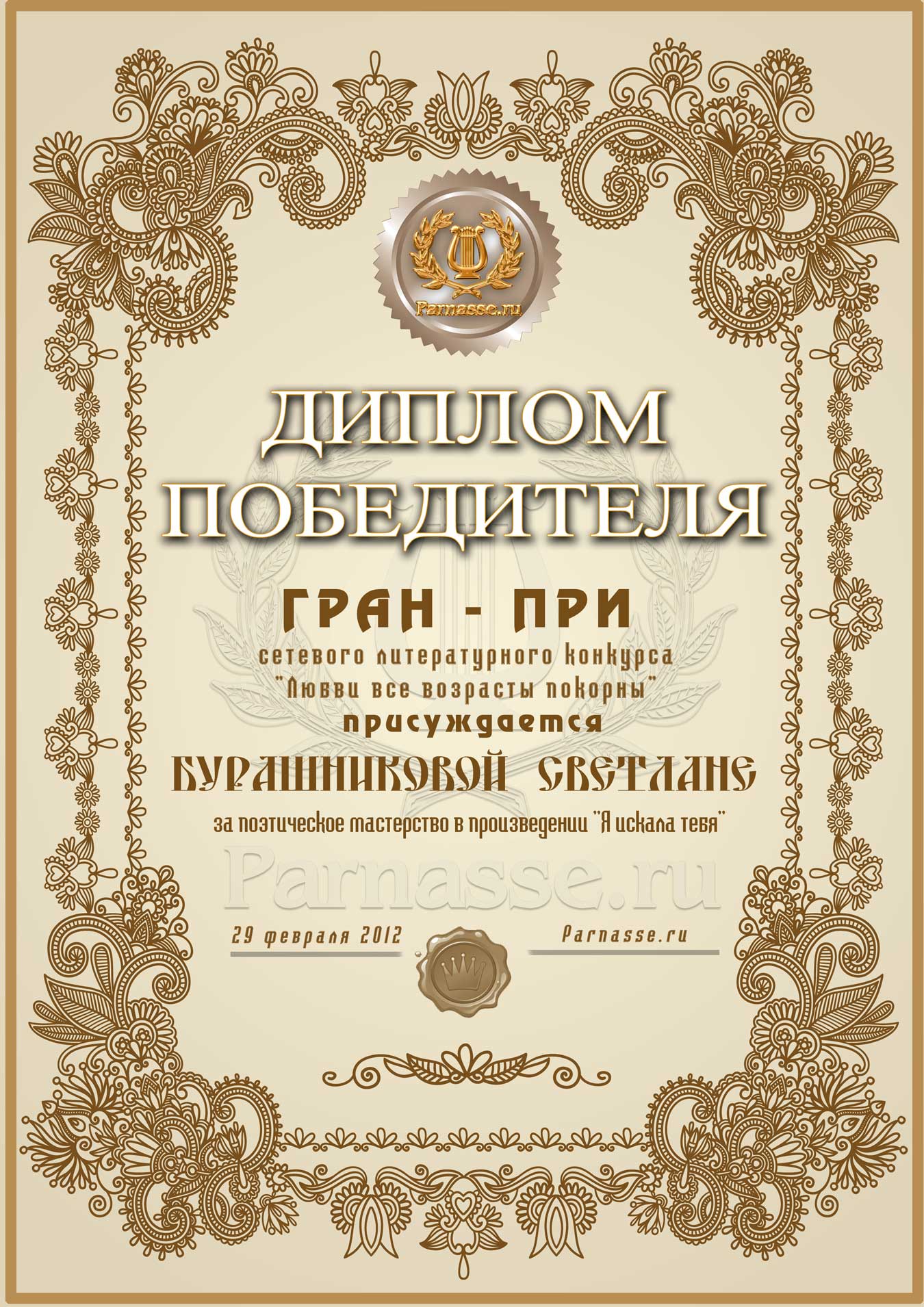 Лауреат 4-го Международного конкурса "Золотая строфа"