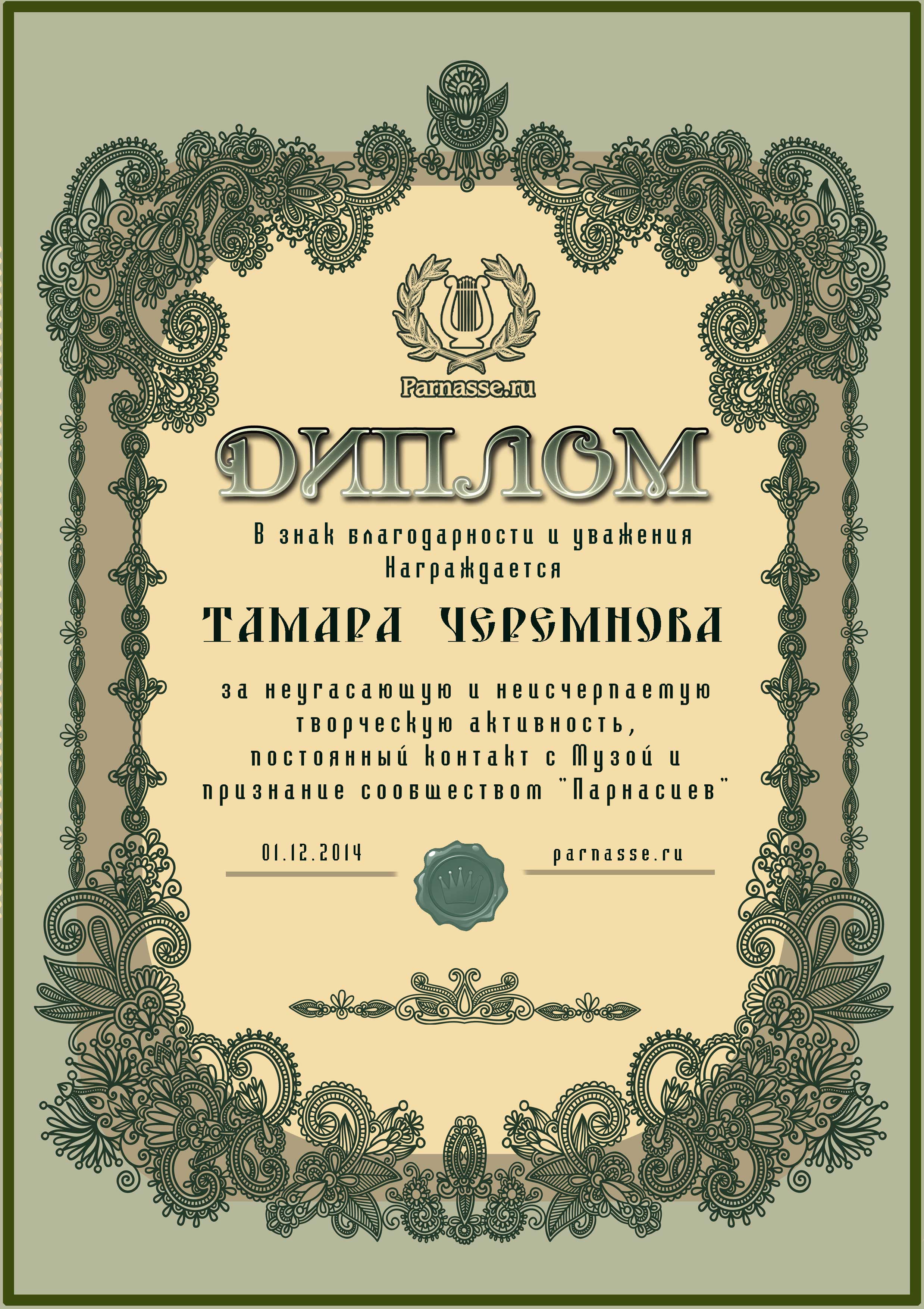 За неугасающую и неисчерпаемую творческую активность, постоянный контакт с Музой и признание сообществом "Парнасцев".От всей души желаем Вам, Тамара, здоровья, любви, успехов, благополучия, удачи и творческого вдохновения!