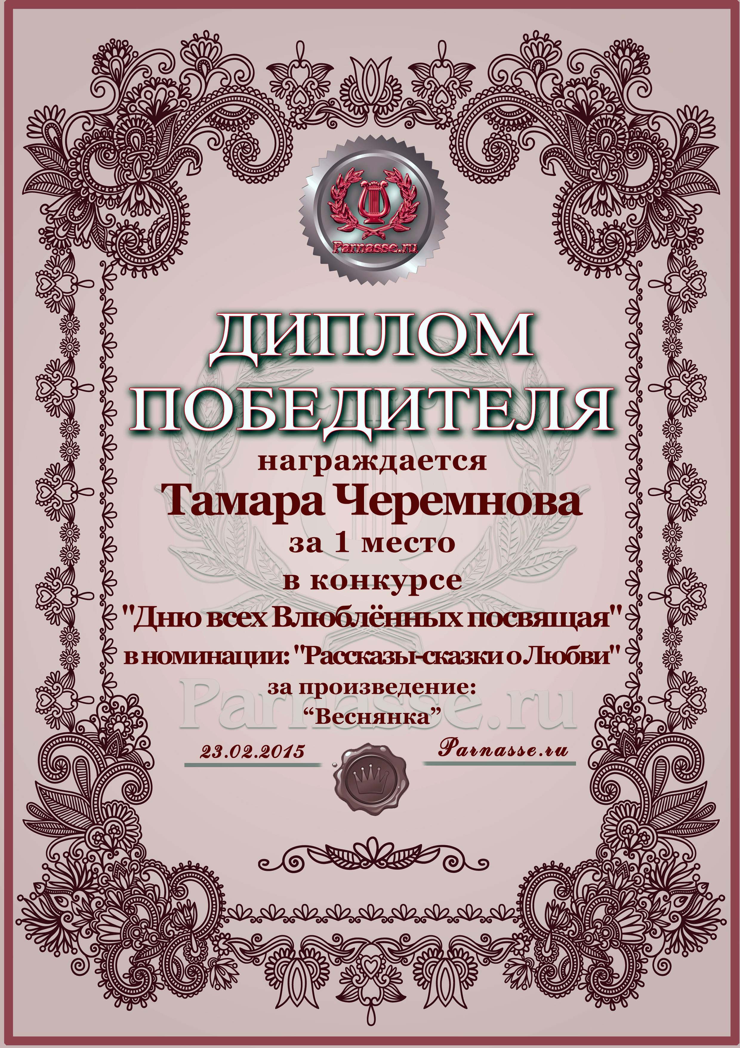 Диплом за 1 место в конкурсе "Дню всех Влюблённых посвящая"