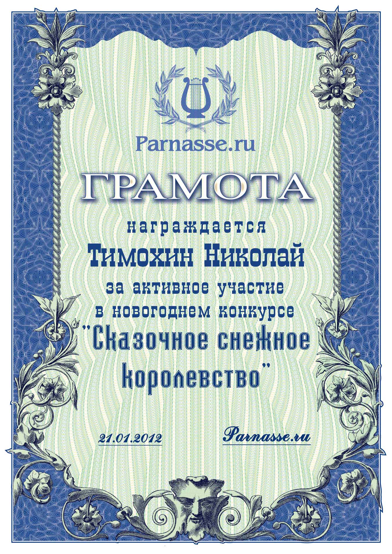 Грамота участника литературного конкурса "Сказочное снежное королевство"