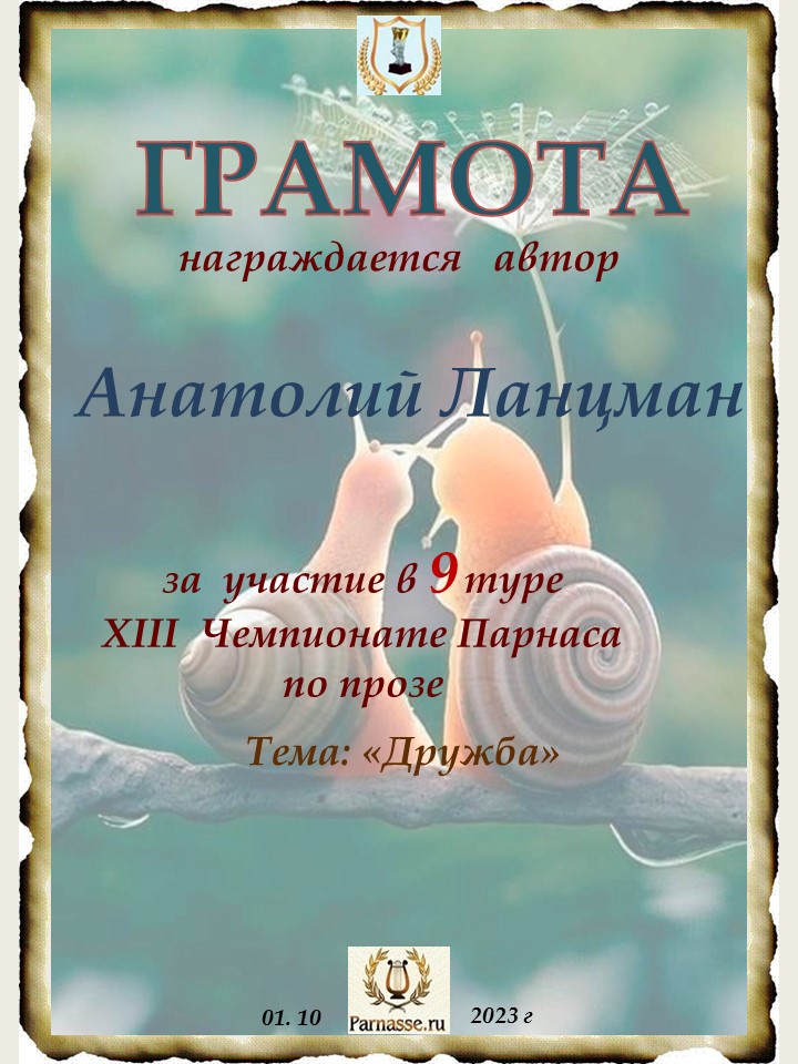 ![]() Медаль автора участника в 9 туре XIII Чемпионата Парнаса по прозе