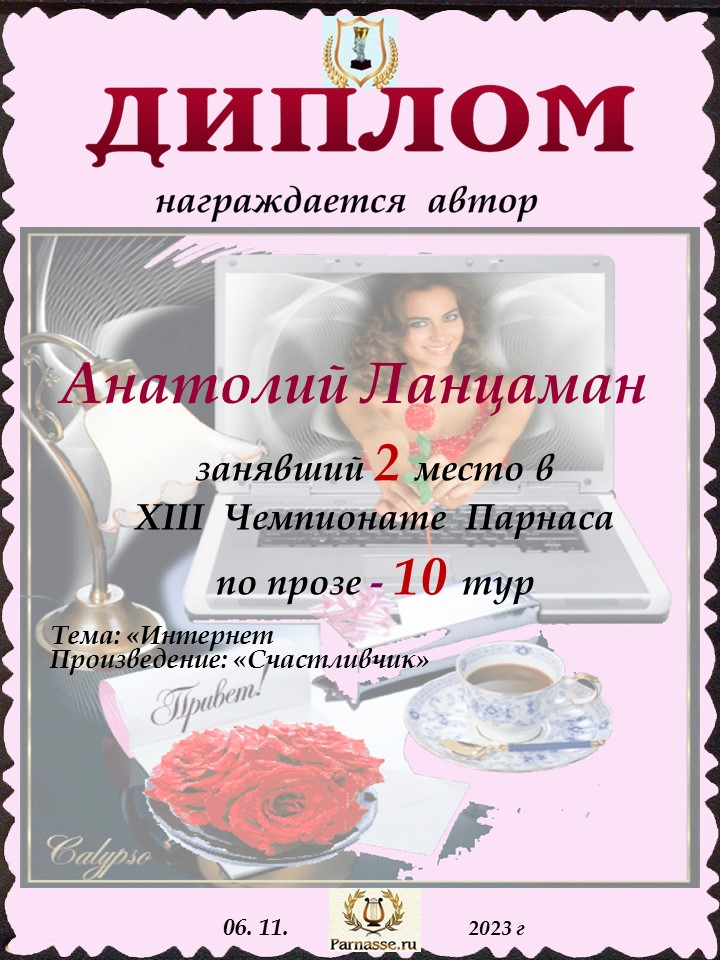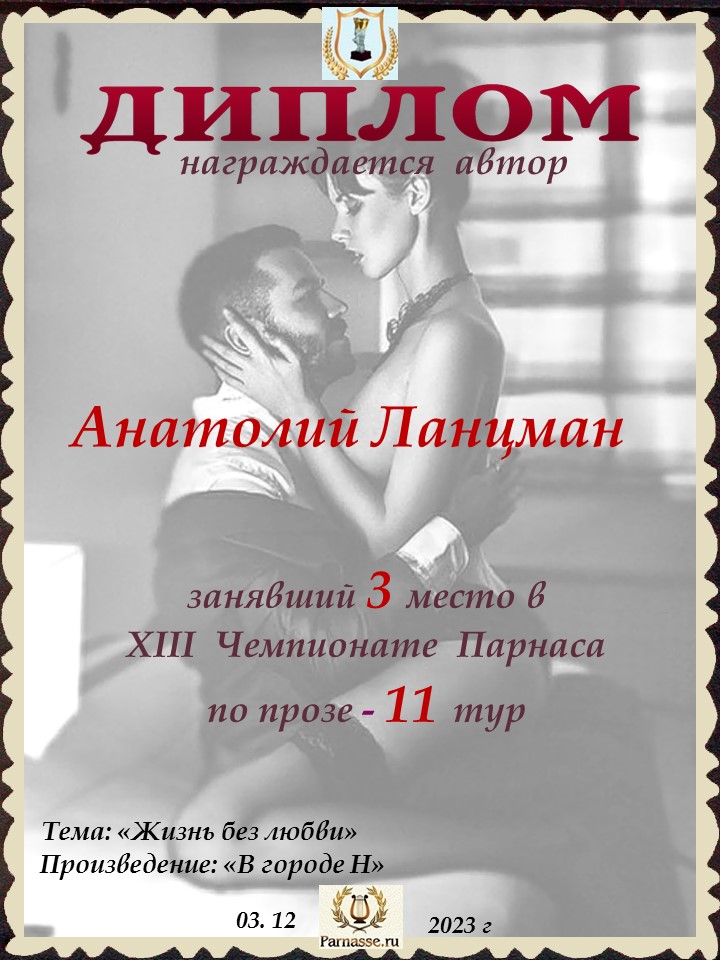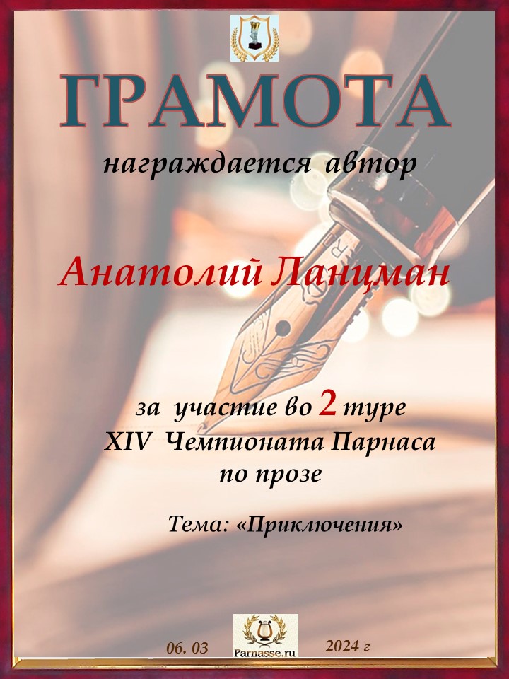 Поздравляю с занятым 2 местом в 10 туре XIII Чемпионата Парнаса по прозе! Спасибо за ожидание и понимание!
