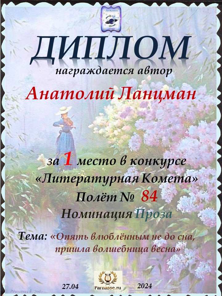 Поздравляю с занятым 1 местом в конкурсе "ЛитКомета - Полёт № 84" - Номинация Проза!