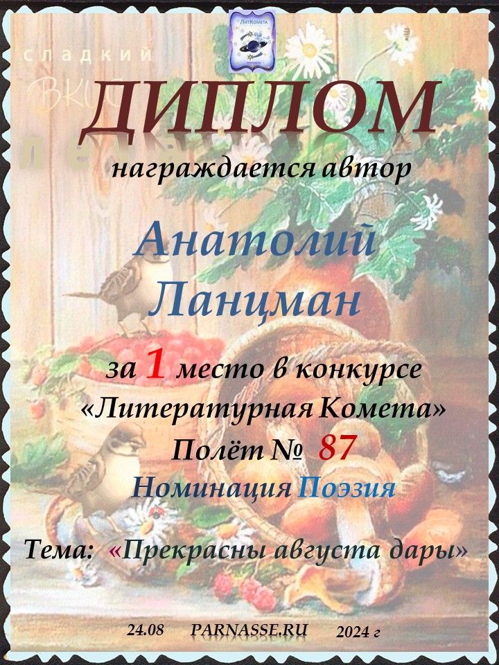 Поздравляю с занятым 1 местом в конкурсе "ЛитКомета - Полёт № 87" - Номинация Поэзия!