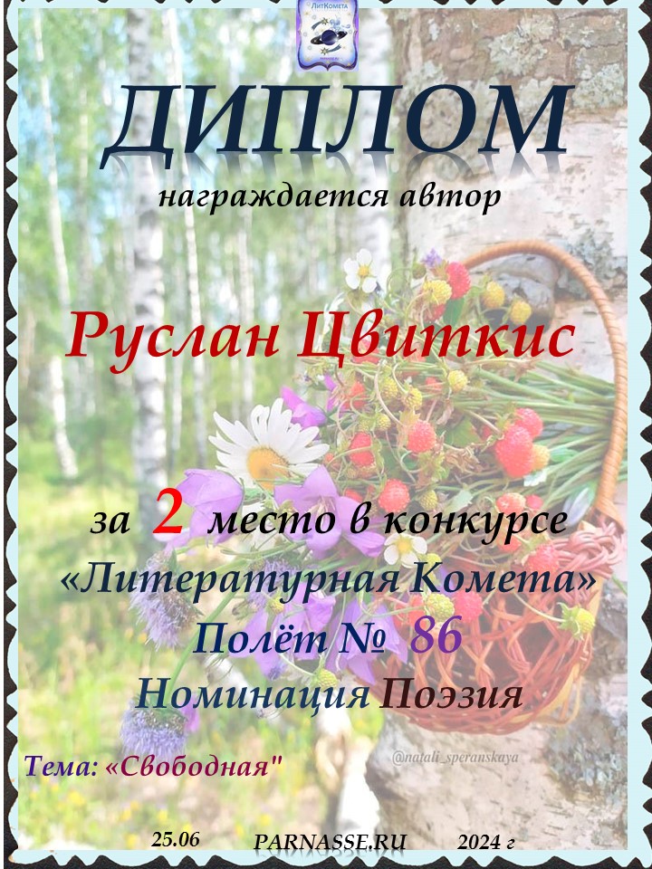 Поздравляю с занятым 2 местом в конкурсе "ЛитКомета - Полёт № 94" - Номинация Поэзия!