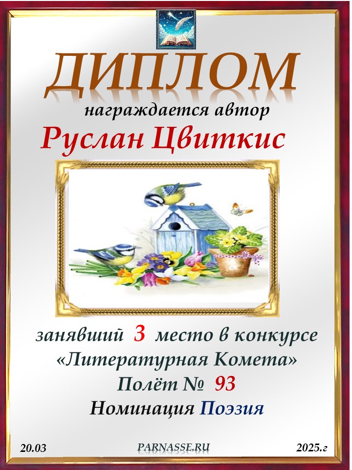 Поздравляю с занятым 3 местом в конкурсе "ЛитКомета - Полёт № 93" - Номинация Поэзия!