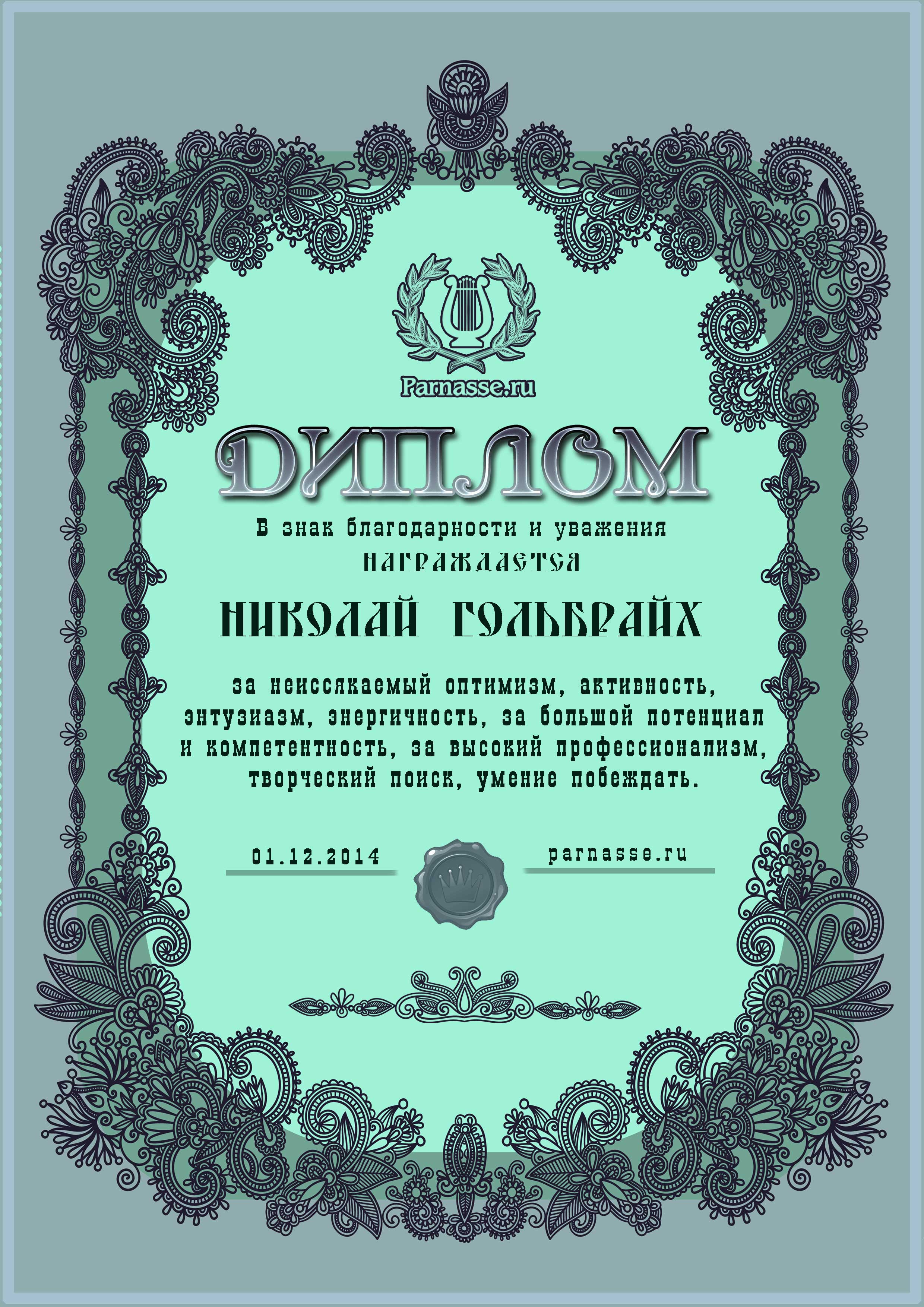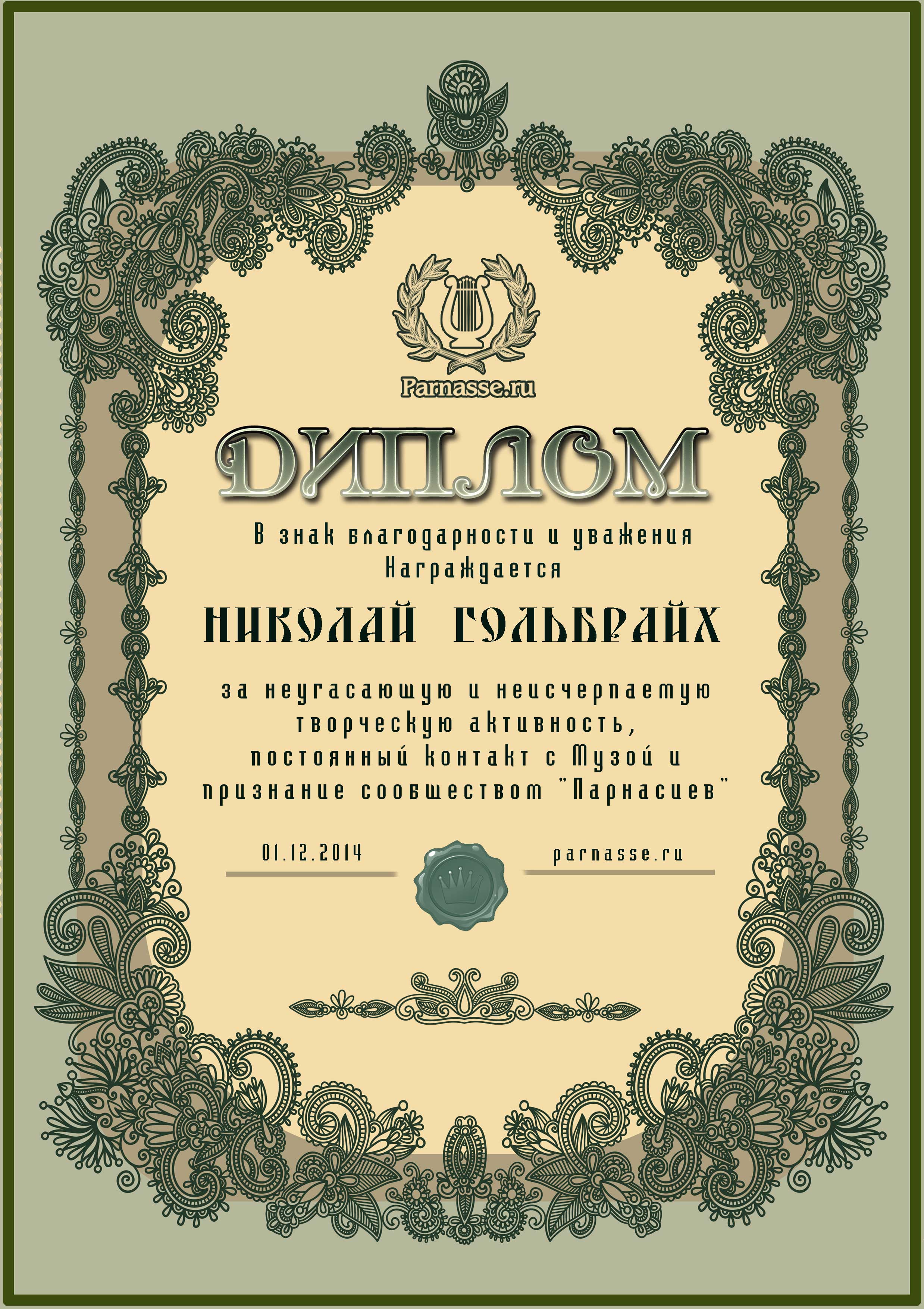 За неугасающую и неисчерпаемую творческую активность, постоянный контакт с Музой и признание сообществом "Парнасцев".