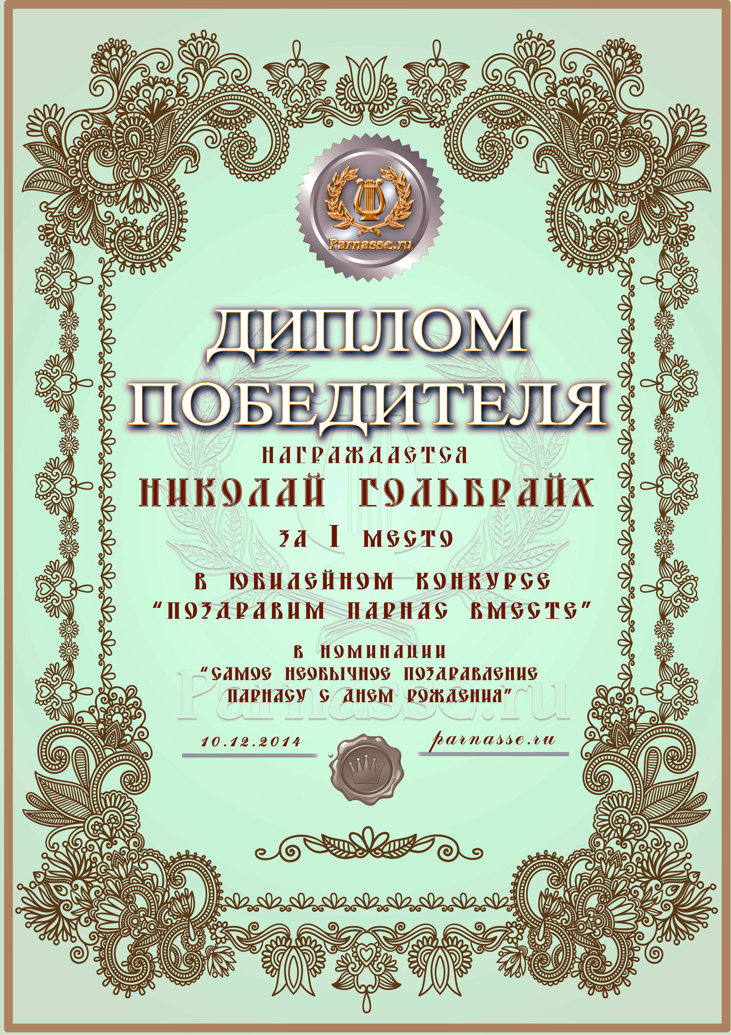 Первое место в праздничном конкурсе "ПОЗДРАВИМ ПАРНАС ВМЕСТЕ!", в номинации "Лучшее стихотворное поздравление Парнасу". Позвольте от всей души выразить Вам благодарность за прекрасные поэтические слова поддержки, самые тёплые пожелания нашему Парнасу и пожелать Вам новых побед на литературном поприще, успехов в жизни и всех Ваших начинаниях! Будьте счастливы, здоровы, пусть удача не покидает Вас ни на минуту и от всей души СПАСИБО! Оставайтесь с нами и мы будем вновь и вновь встречать Дни рождения "Парнаса" в одной дружной, душевной компании! Произведение "НА ДЕНЬ РОЖДЕНИЯ «ПАРНАСА»!!!"
