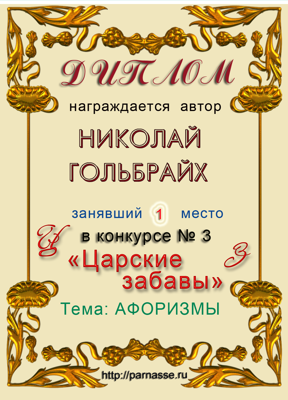 Диплом за 1 место в праздничном конкурсе "Поздравим Парнас с трёхлетием вместе!"