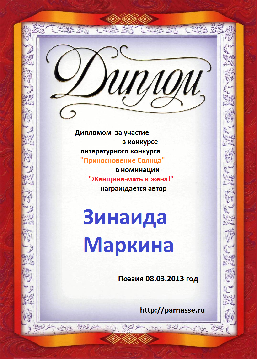 Диплом в конкурсе поэзии "Прикосновение Солнца"