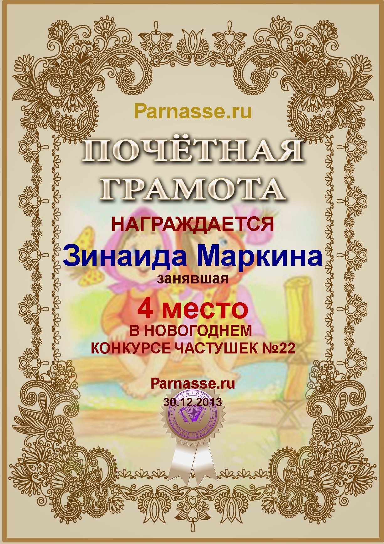 Третье место в музыкально-литературном конкурсе "Предновогодний Вкусный" в номинации "Вкусные рассказы, сказки - проза с рецептом", произведение "Салат для опоздавшего", судейское голосование. Поздравляем с прекрасной победой. Счастья Вам, здоровья, удачи во всем, благополучия и вдохновения. Новых замечательных произведений.