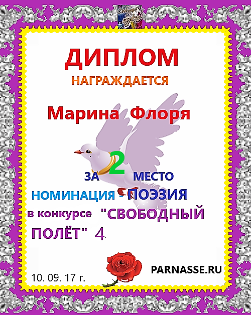 ![]() за 2 место в конкурсе "Свободный Полёт" № 4 ПОЭЗИЯ