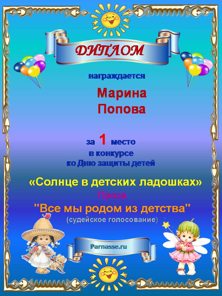 За ПЕРВОЕ место в конкурсе, посвященном Дню защиты детей. Судейское голосование. Прозаическая номинация "Все мы родом из детства". Замечательное произведение "Два дня из жизни Ромы". Поздравляем с блестящей, заслуженной победой!