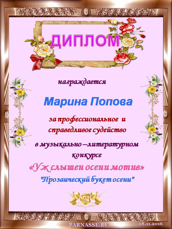 Благодарим Вас, Марина, за квалифицированное, профессиональное и объективное судейство номинации "Прозаический букет осени" в конкурсе "Уж слышен Осени мотив". Огромное спасибо! Прекрасного вам настроения, удачи, здоровья, благосостояния и мегапозитива во всем. Спасибо за Вашу искренность, душевность и Ваш писательский талант! С уважением.