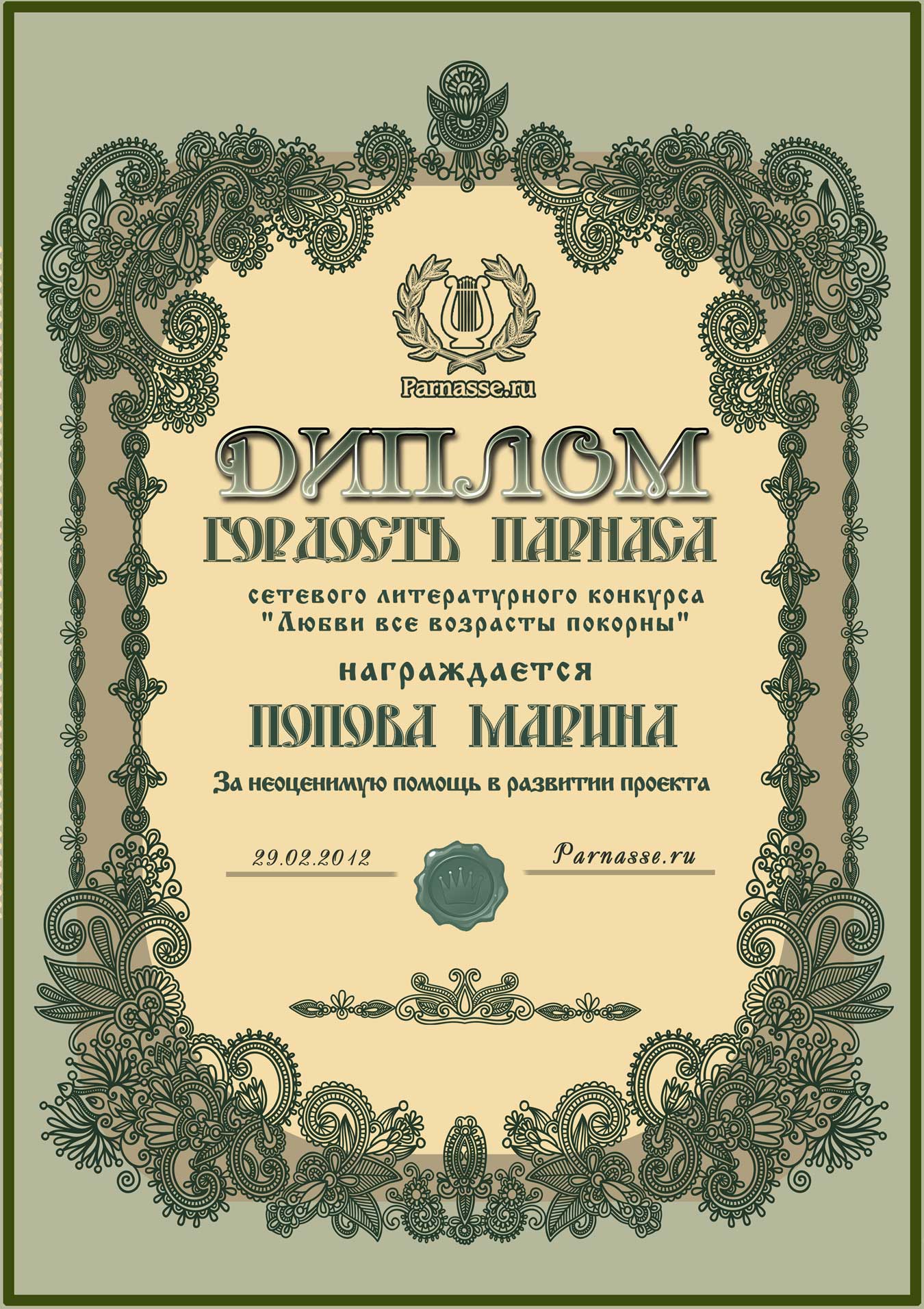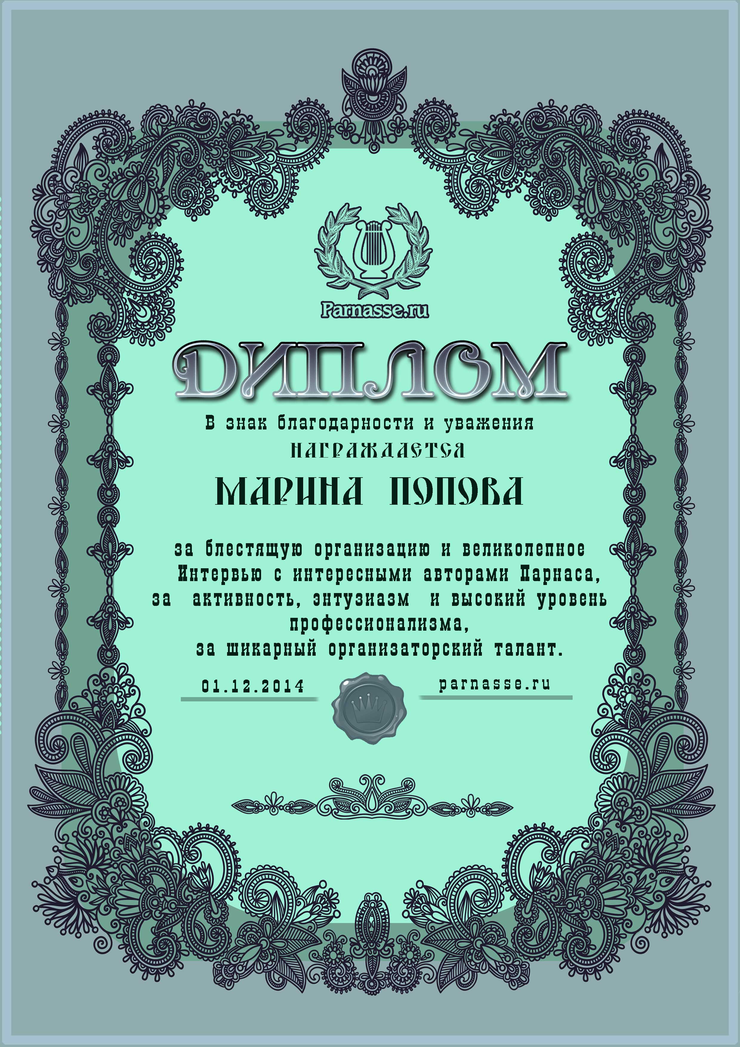 За неугасающую и неисчерпаемую творческую активность, постоянный контакт с Музой и признание сообществом "Парнасцев".От всей души желаем Вам, Марина, здоровья, любви, успехов, благополучия, удачи и творческого вдохновения!