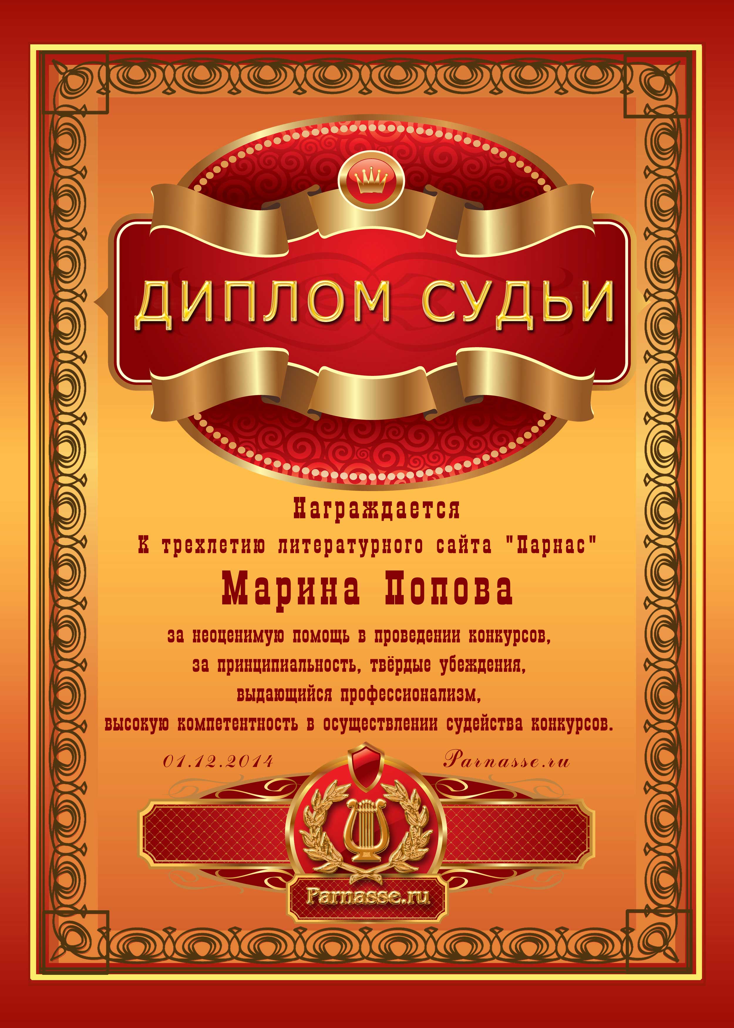 Диплом судьи сетевого литературного конкурса "Любви все возрасты покорны"
