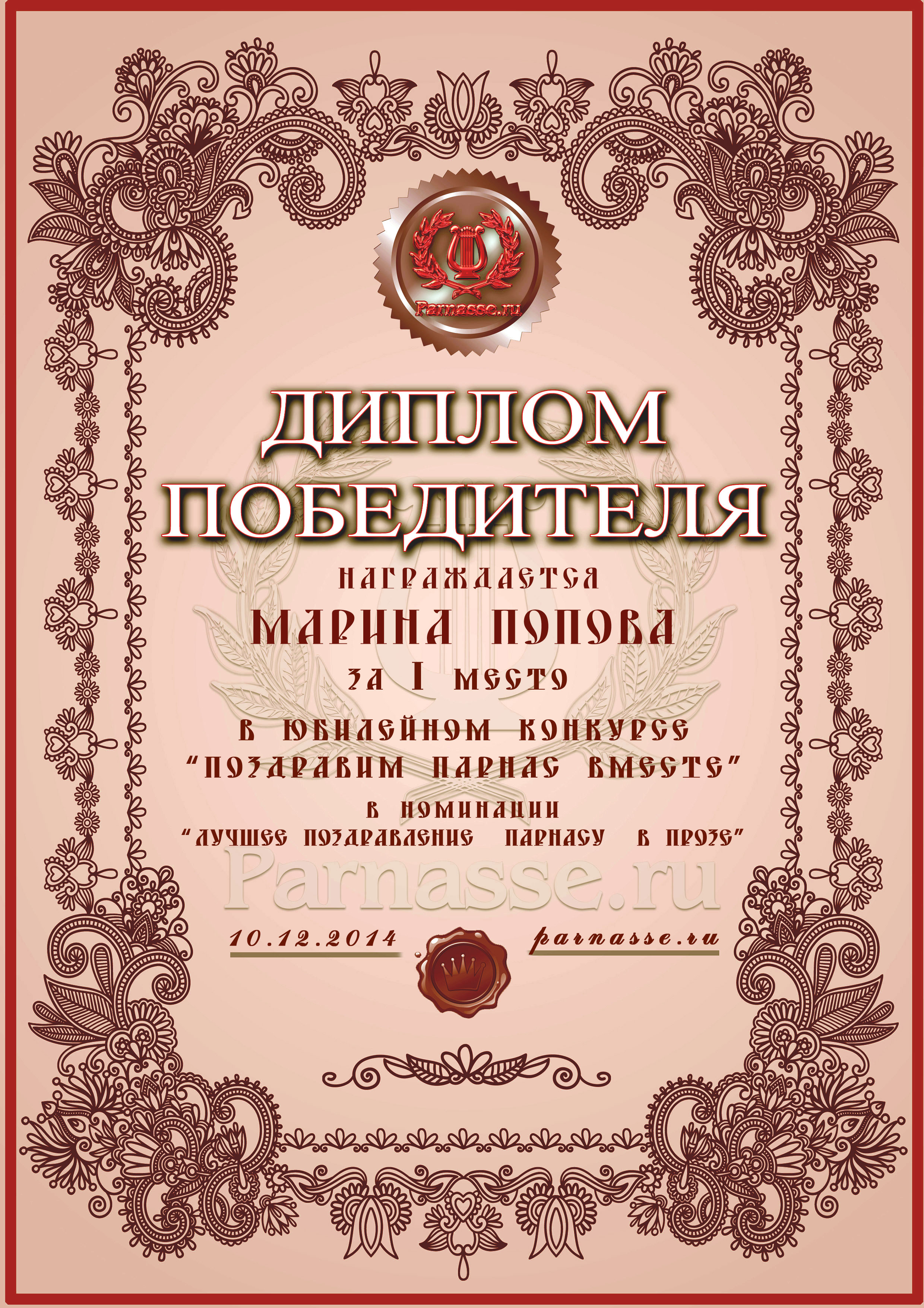 Диплом Победителя за 1 место в праздничном конкурсе "Поздравим Парнас с трёхлетием вместе!"