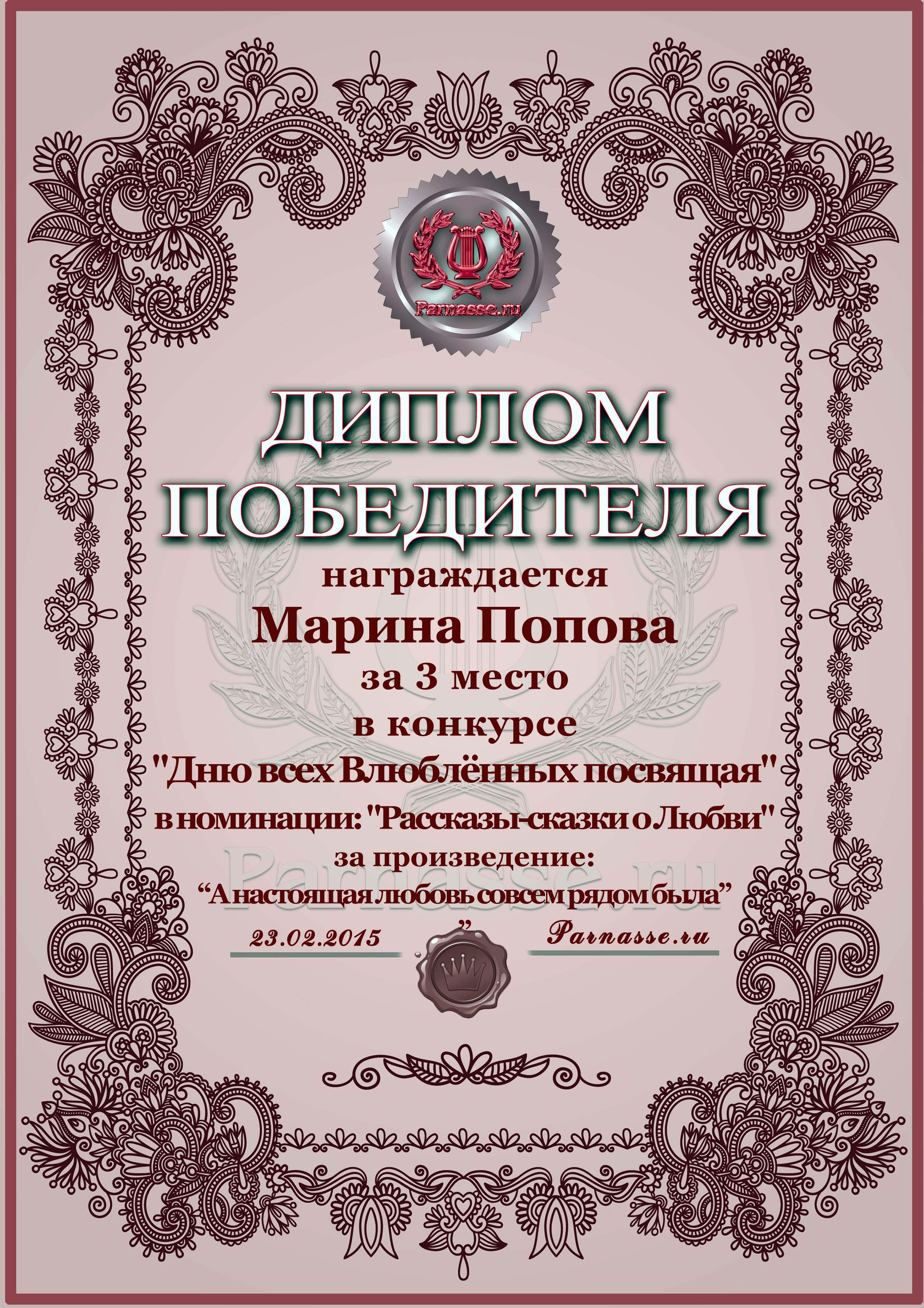 Диплом за 3 место в конкурсе "Дню всех Влюблённых посвящая"