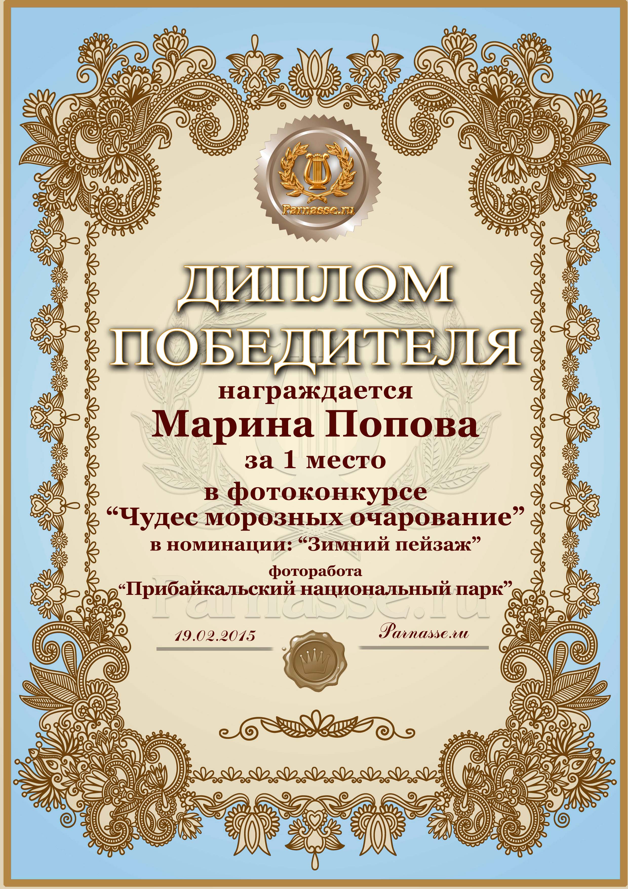 Диплом за 1 место в фотоконкурсе "Чудес морозных очарование"