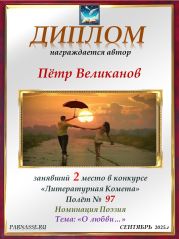 Поздравляю с занятым 2 местом в конкурсе «Литературная Комета – Полёт № 34» - номинация поэзия!