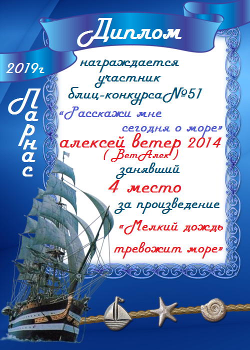 Четвёртое место в Блиц-конкурсе №51 «Расскажи мне сегодня о море» за произведение «Мелкий дождь тревожит море». Поздравляем!