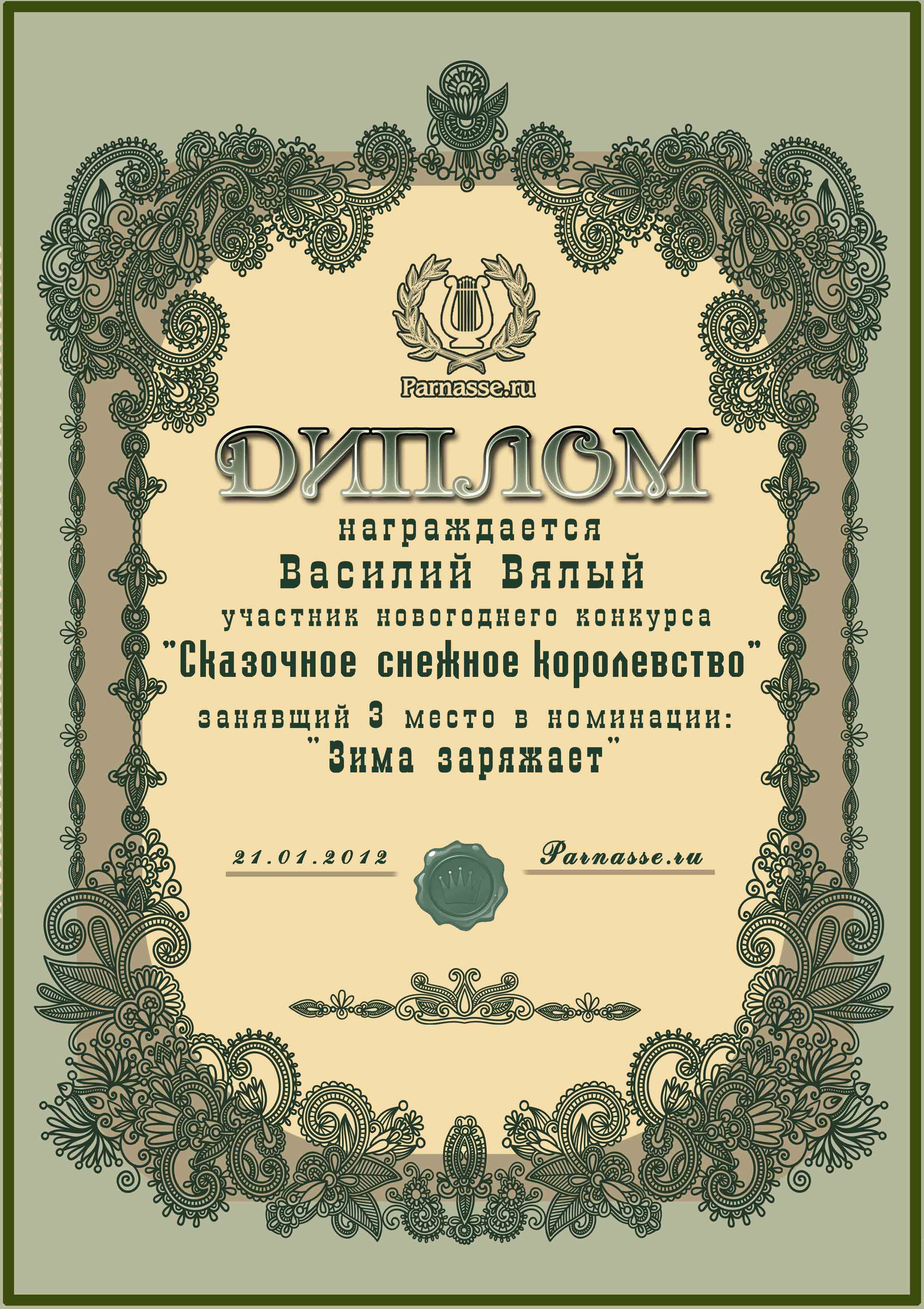 От лица Администрации творческого портала "Парнас" вручаем Вам этот памятный знак с самыми наилучшими пожеланиями! Пусть Вас весь год не покидает творческий запал, удача, а здоровье будет столь же крепким и нерушимым, как и традиция Новогоднего праздника! Счастья, успехов и любви Вам и Вашей семье, друзьям и близким!