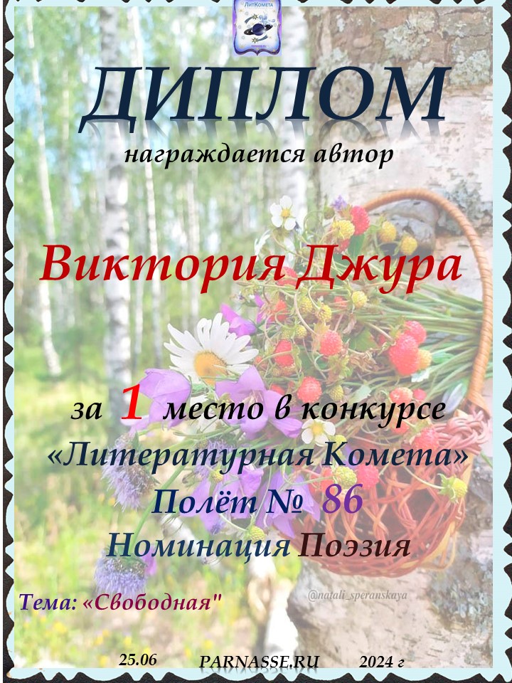 Поздравляю с занятым 1 местом в конкурсе "ЛитКомета - Полёт № 86" - Номинация Поэзия!