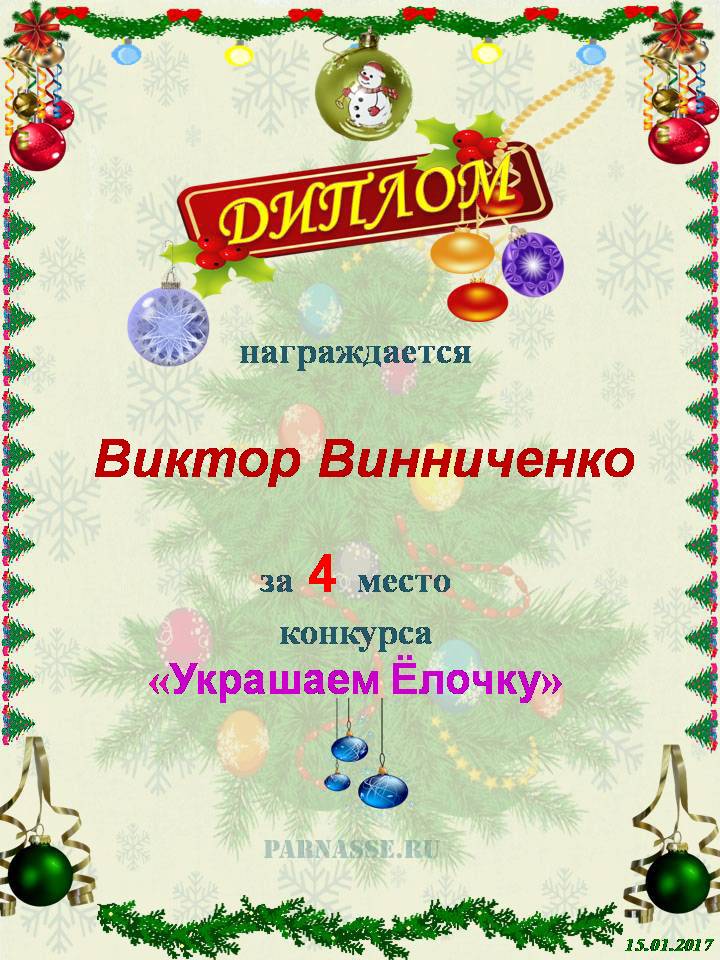 Примите наши поздравления, Дорогой Виктор, и пожелания удачи Вам, стального здоровья и бесконечных сил на Ваше замечательное творчество! Пусть каждый последующий Новый Год будет в несколько раз лучше, чем предыдущий, с каждым шагом приближая Вас к абсолютному счастью! Мы поздравляем Вас с великолепным и достойным результатом и торжественно вручаем Вам медаль победителя в конкурсе "Новогодние Ёлочки"!