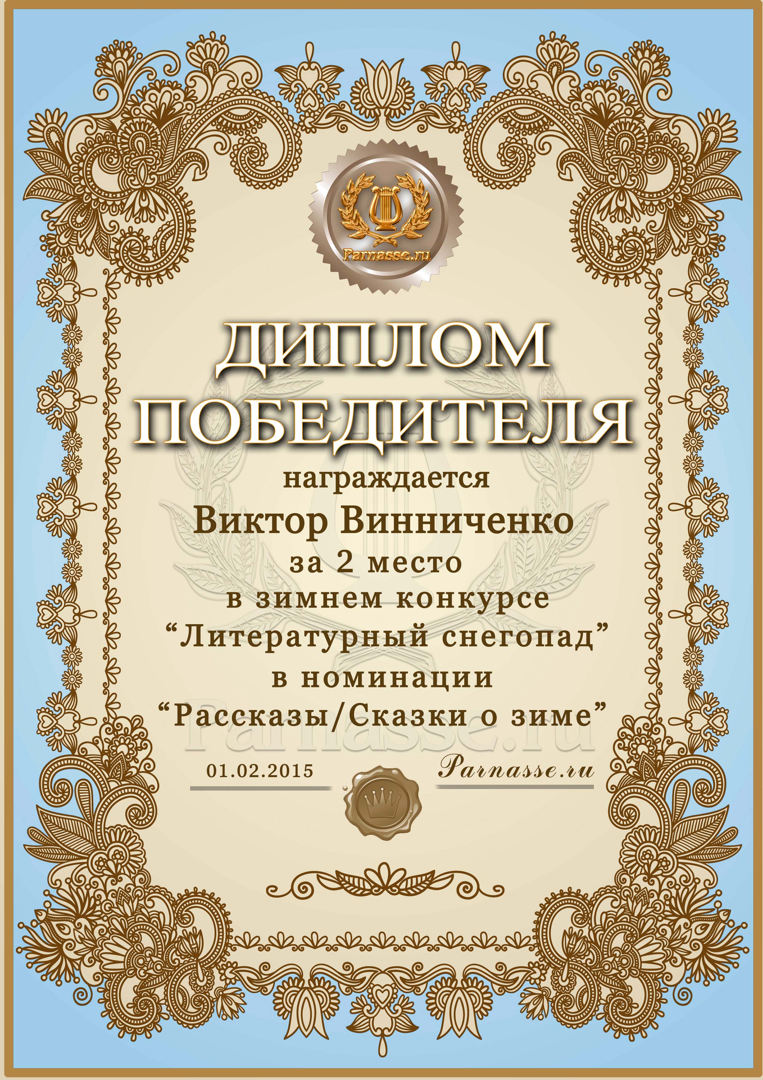 Второе место в музыкально-литературном конкурсе "Литературный снегопад", прозаическая номинация, судейское голосование, произведение "Страшная история". Поздравляем!