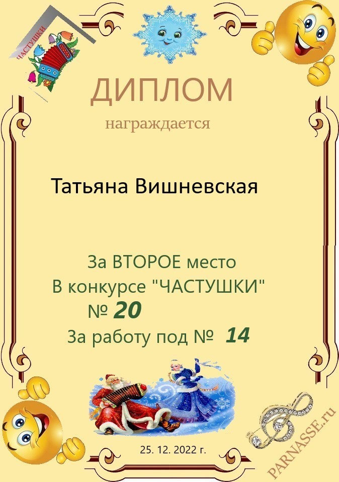 За 2 место в конкурсе "ЧАСТУШКИ" № 20...за работу под № 14