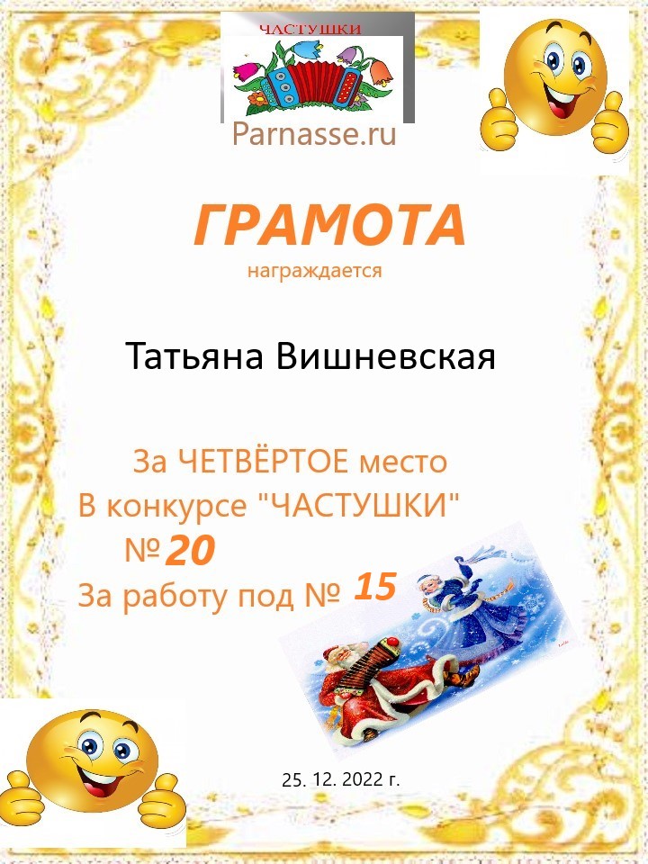 3 место в конкурсе"ЧАСТУШКИ" № 21...за работу под № 22
