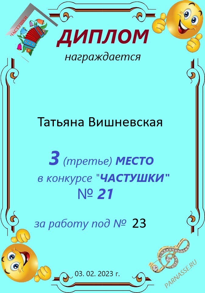 3 место в конкурсе"ЧАСТУШКИ" № 21...за работу под № 23
