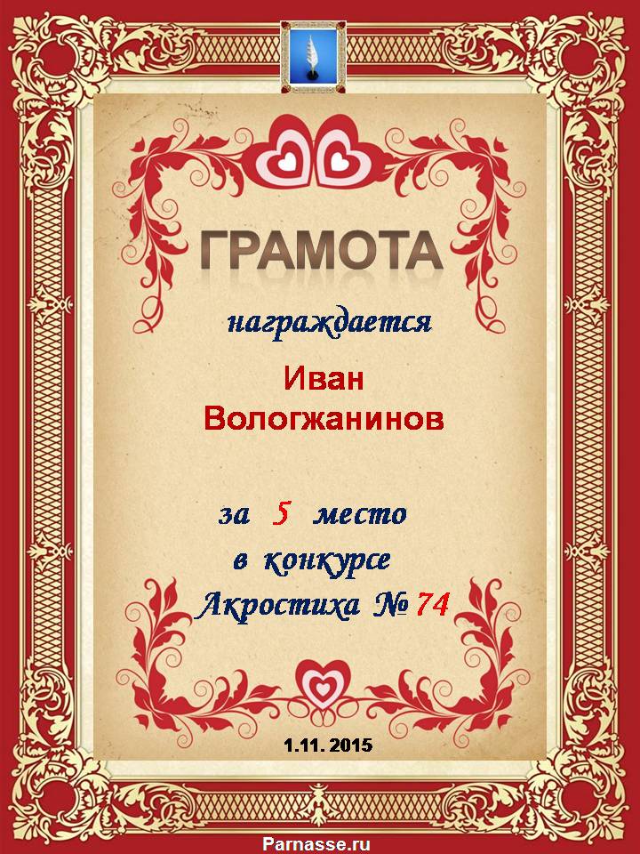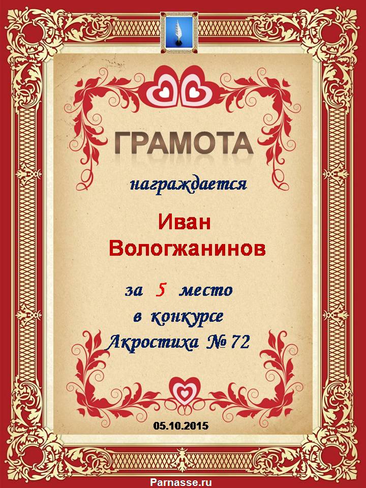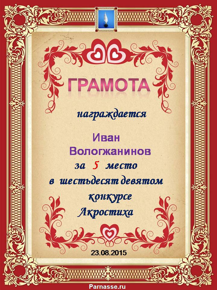 Грамота за 5 место во 2 годовом конкурсе Акростиха по итогам судейского голосования (Альтернатива)! ПОЗДРАВЛЯЮ!
