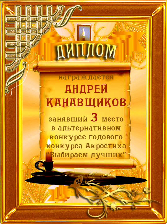 Диплом за 3 место в 1 годовом итоговом конкурсе АКРОСТИХА "Выбираем лучших" (Альтернатива)! ПОЗДРАВЛЯЮ!