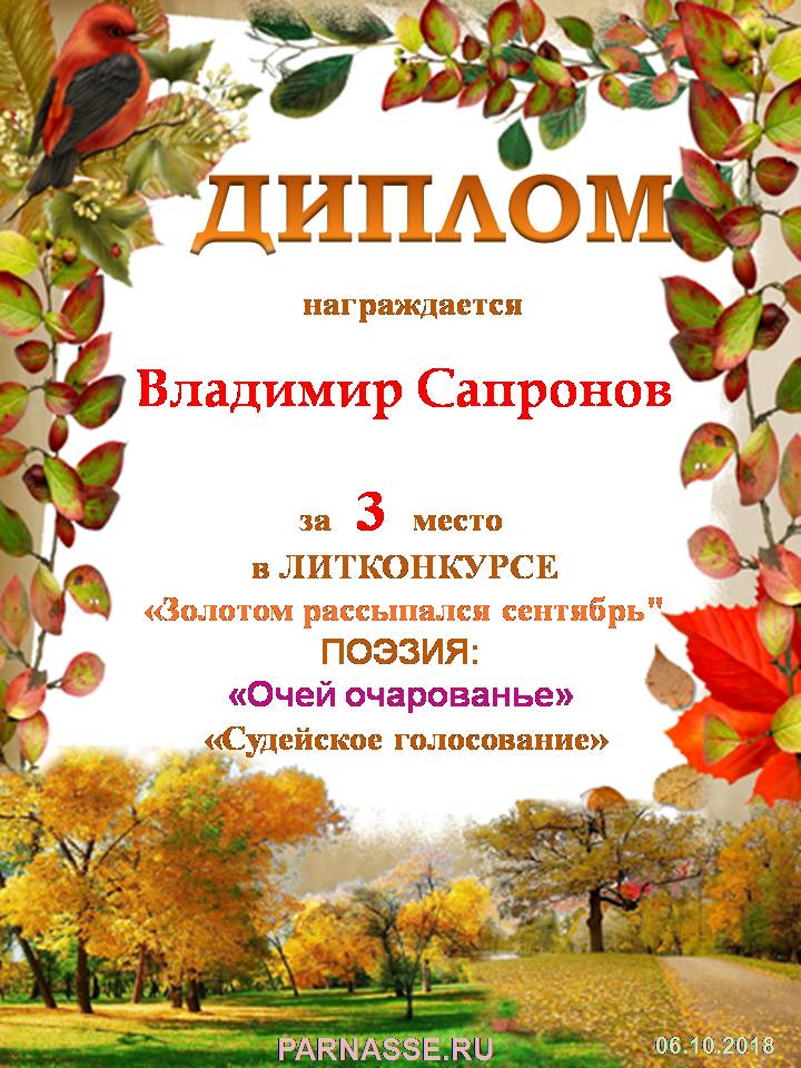 Поздравляем с занятым 3 местом в ЛИТКОНКУРСе «Золотом рассыпался сентябрь.,,», номинация – Поэзия (народное голосование)!