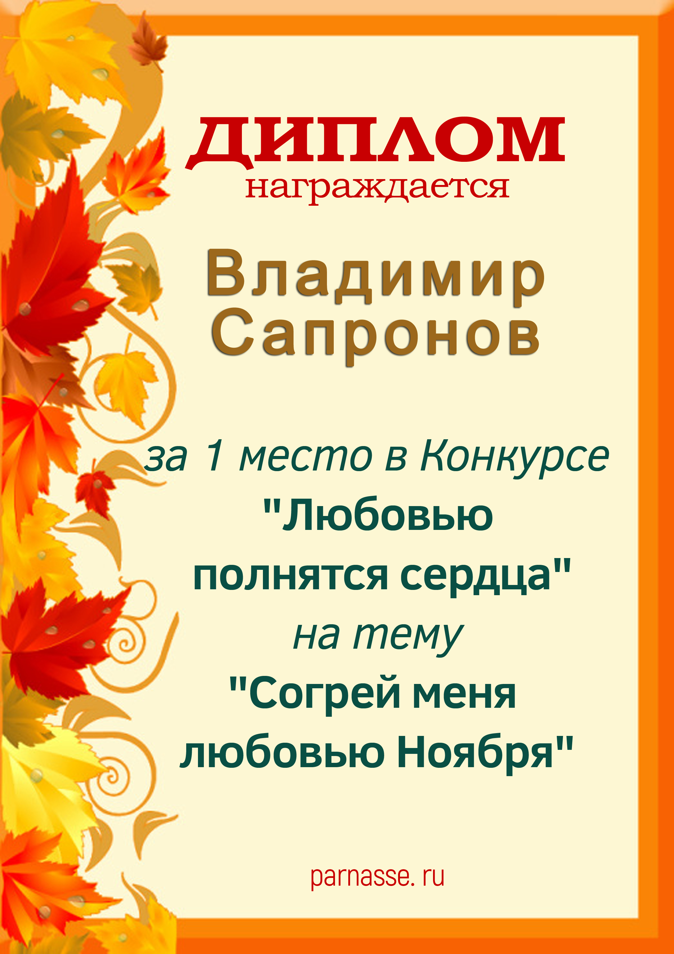 За участие в ЛитКонкурсе "Золотом рассыпался сентябрь" в поэтической номинации "Очей очарование". Спасибо за великолепный конкурсный стих! Желаем яркой, радостной, счастливой, доброй, весёлой, чарующей осени, которая подарит Вам вдохновение, нежные мечты, светлые надежды и тёплые улыбки.
