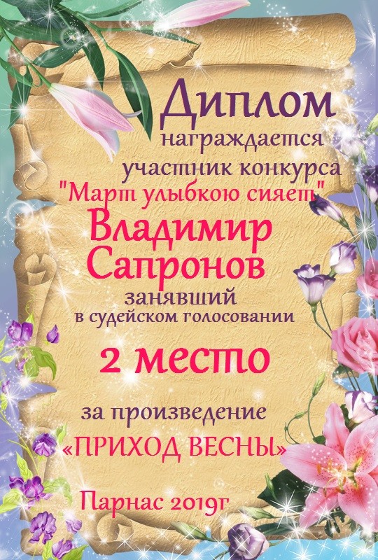 Первое место в серии весенних конкурсов "Дивной сказкой Весна возвращается снова", судейское голосование. Поздравляем с прекрасной победой!