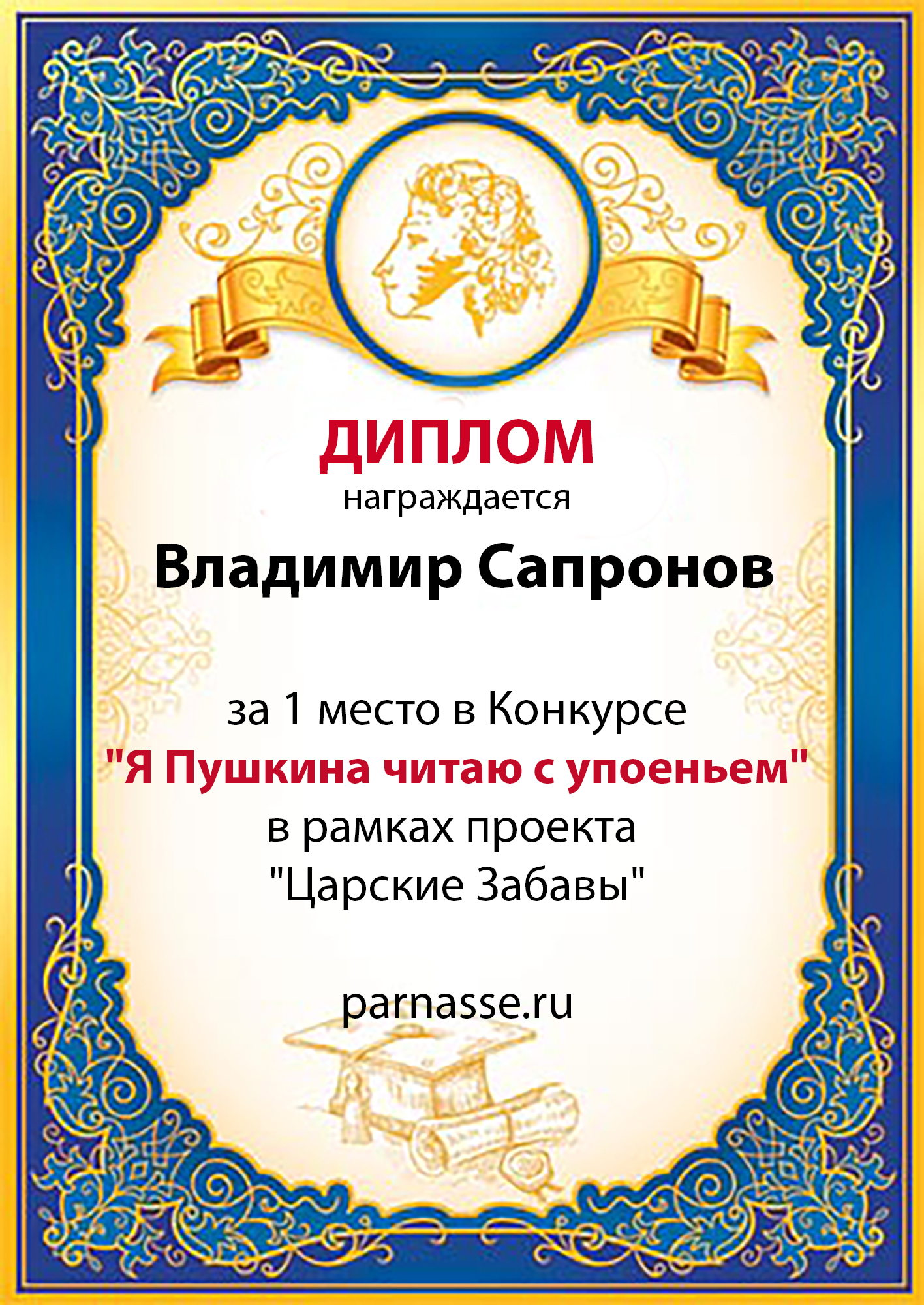 За 1 место в Конкурсе "Я Пушкина читаю с упоеньем" в рамках проекта "Царские Забавы"
