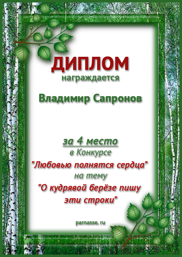 За 4 место в Конкурсе "Любовью полнятся сердца" на тему "О кудрявой берёзе пишу эти строки"