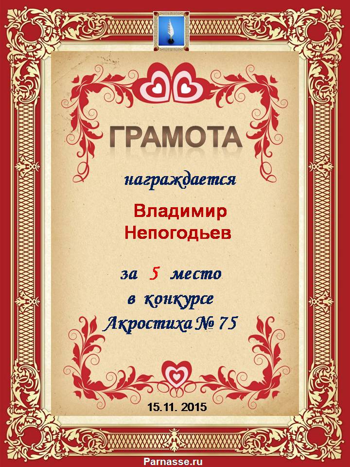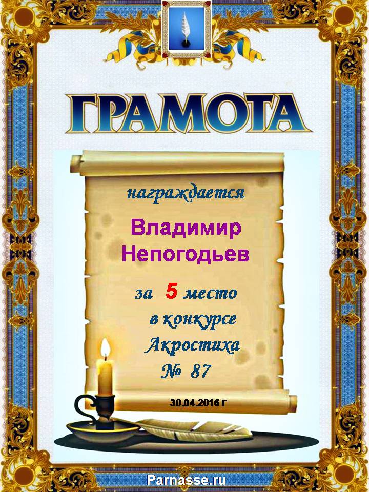Грамота за 5 место в 110 конкурсе АКРОСТИХА (Альтернатива)! ПОЗДРАВЛЯЮ!