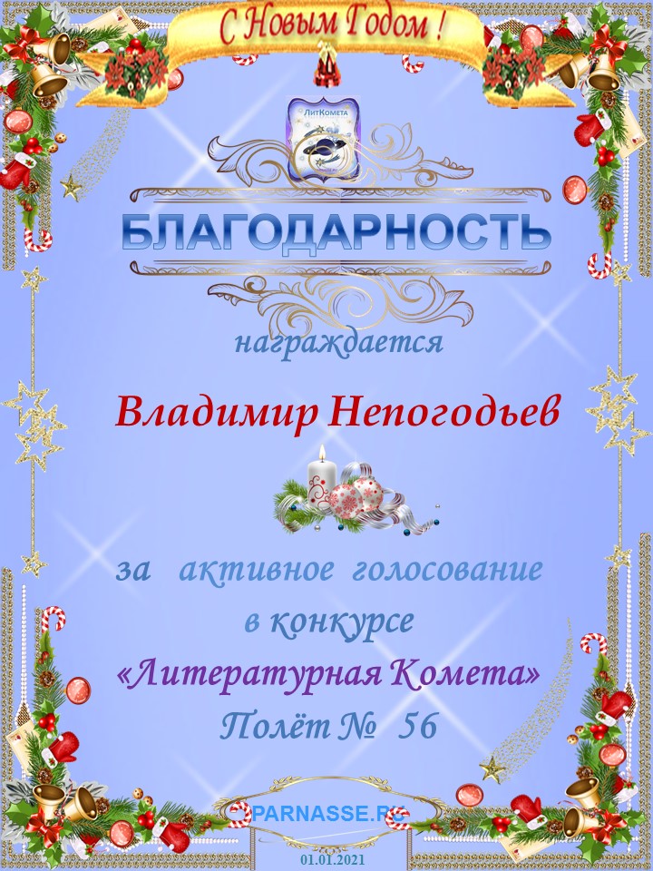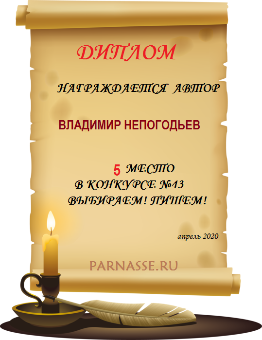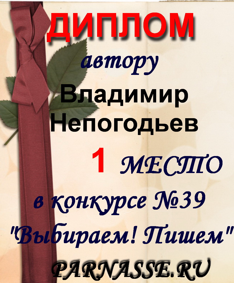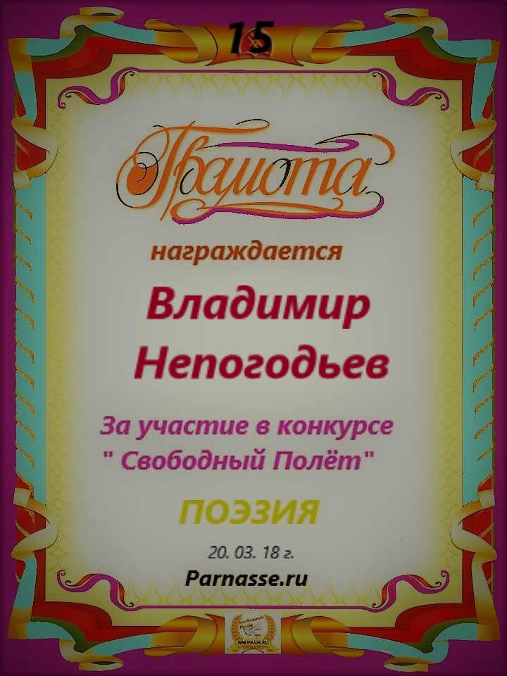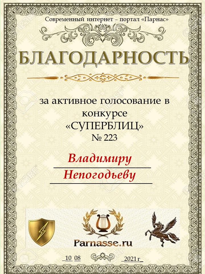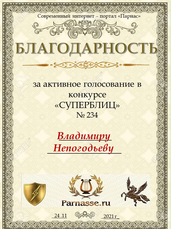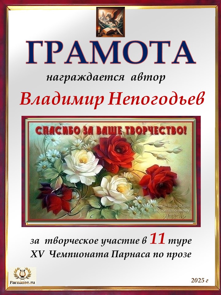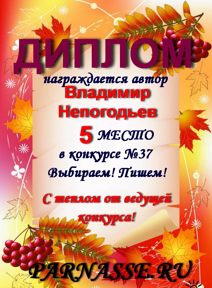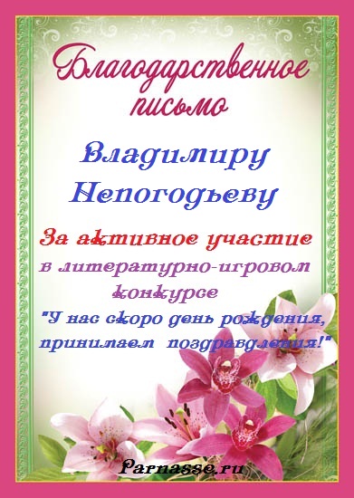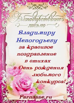 Номинация "Лучшее поздравление Парнасу в прозе".Искренне и от всего сердца благодарим Вас, ВЛАДИМИР, за участие в юбилейном конкурсе, за Ваши прекрасные, ярчайшие слова благодарности нашему порталу! Мы желаем Вам крепкого здоровья, жизнелюбия, творческой Музы и исполнения самых заветных желаний, которые только у Вас есть!